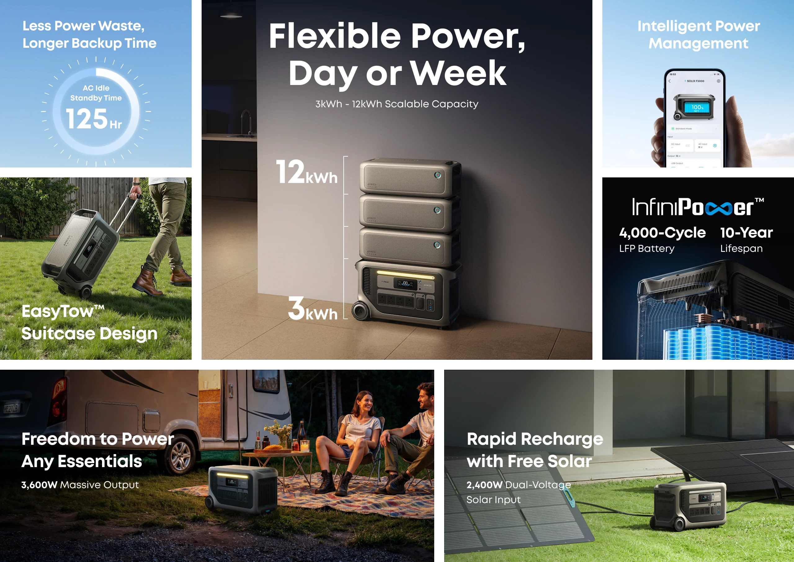 Proširivi kapacitet od 3 do 12 kWh omogućava napajanje prema vašim potrebama – bilo da se radi o životu u kamperu, radu u vrtu, kućnom rezervnom napajanju ili ličnim projektima.
