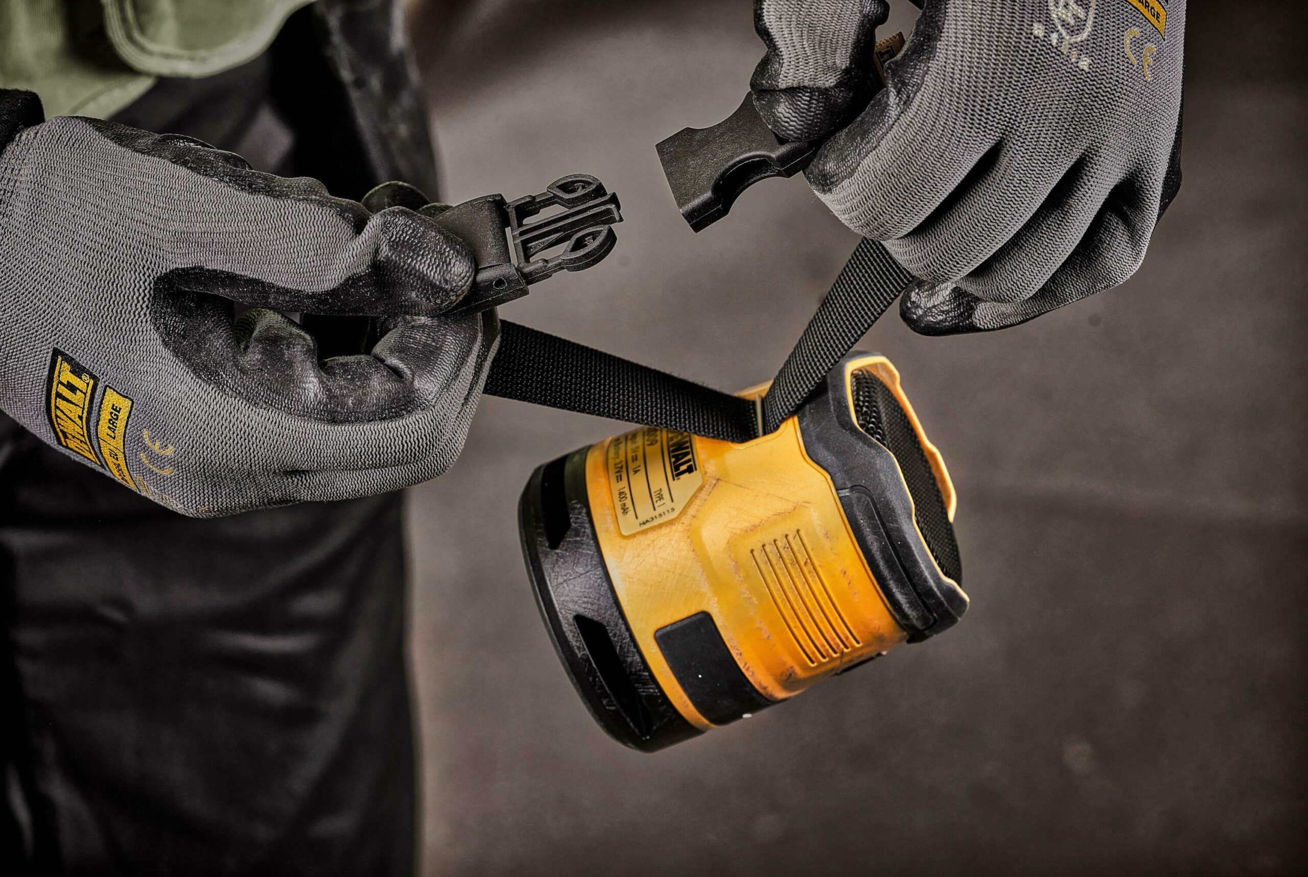 - Vezica s kopčom osigurava da je jedinica jednostavna za transport i može se objesiti na ruksak, pojas ili bilo koju strukturu na gradilištu