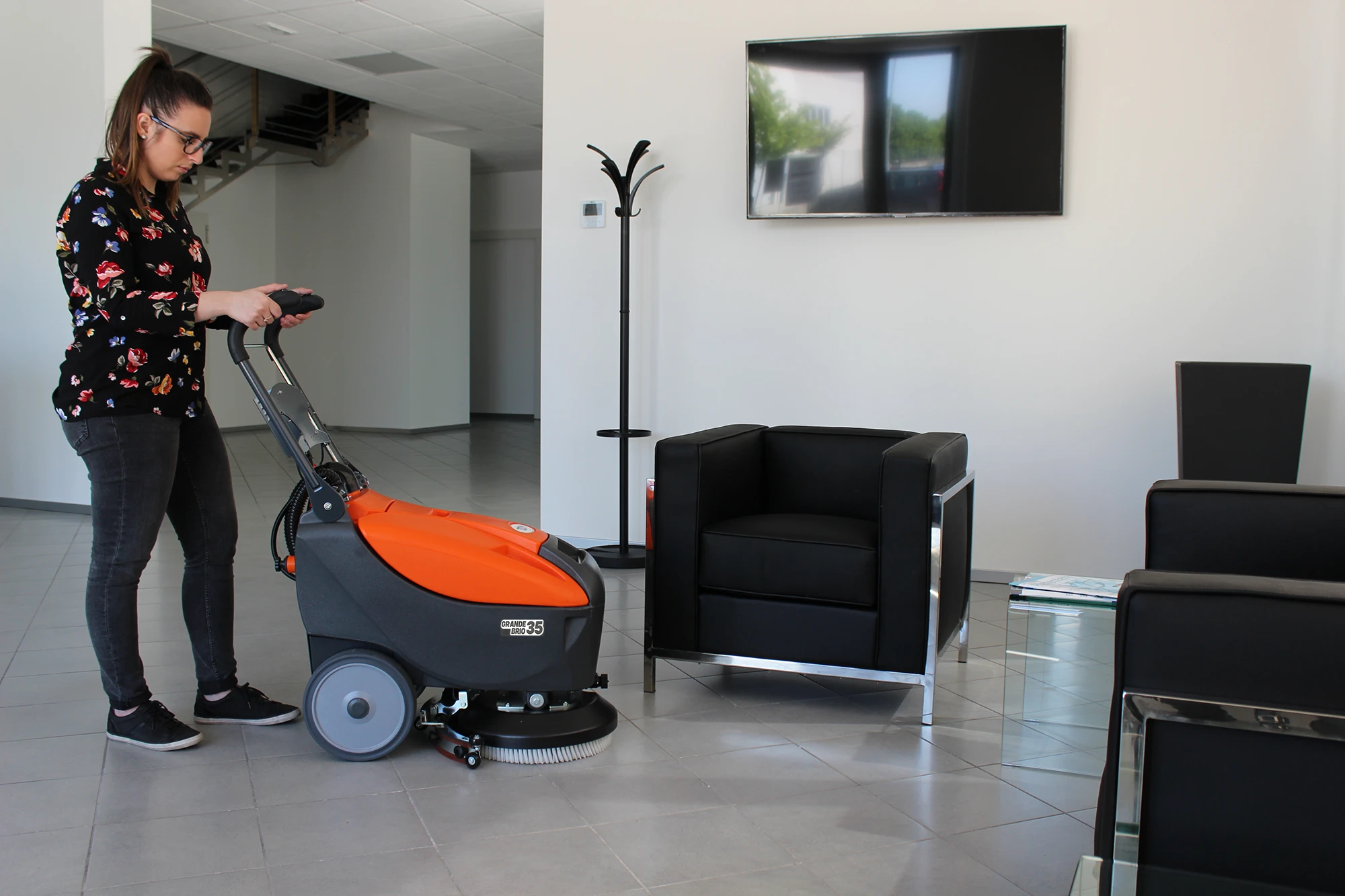 Grande Brio 35 B je najmanja profesionalna samohodna mašina za pranje podova sa jednom baterijom, savršena za čišćenje manjih površina i zamjenu ručnog čišćenja mopom. Zahvaljujući svojim kompaktnim dimenzijama i četki smještenoj sa desne strane, omogućava besprijekorno pranje i sušenje ispod stolova i uz same zidove. Težina ove mašine je koncentrisana na četku kako bi se osigurao konstantan pritisak pranja od 28 kg. Usisna guma paraboličnog oblika postavljena je odmah iza četke, garantujući odlično sušenje bez prskanja, čak i pri skretanju.