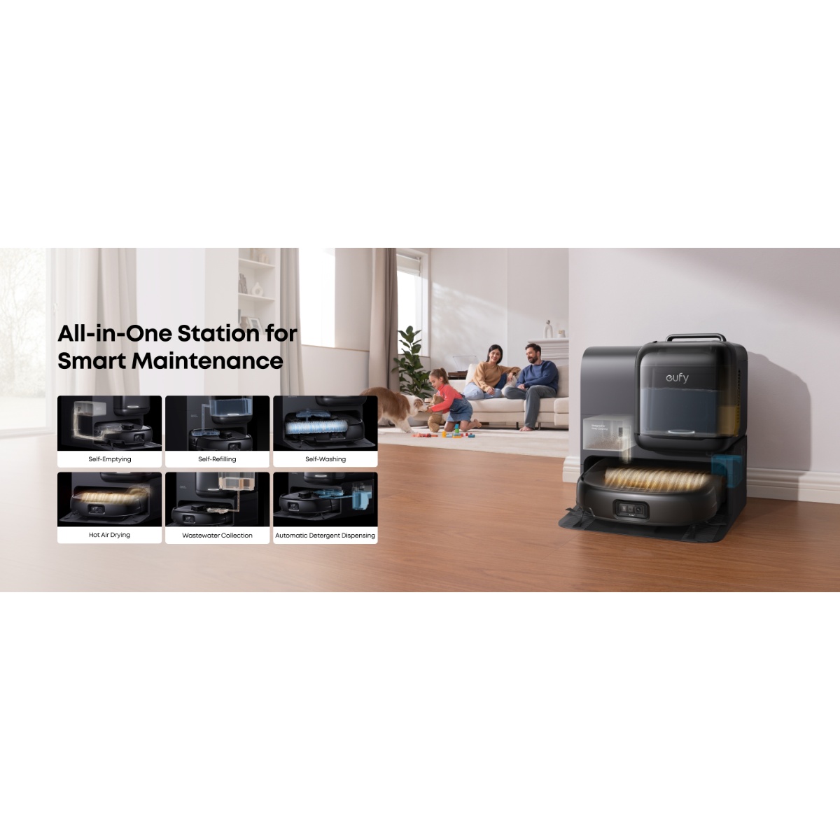 All-in-One Omni stanica omogućava potpuno automatsko održavanje bez ručne intervencije. Stanica automatski prazni prašinu, pere mop, suši ga toplim vazduhom, dopunjava rezervoar vode, dozira deterdžent i prikuplja prljavu vodu. Veliki kapaciteti rezervoara omogućavaju dugotrajan rad bez potrebe za čestim održavanjem.