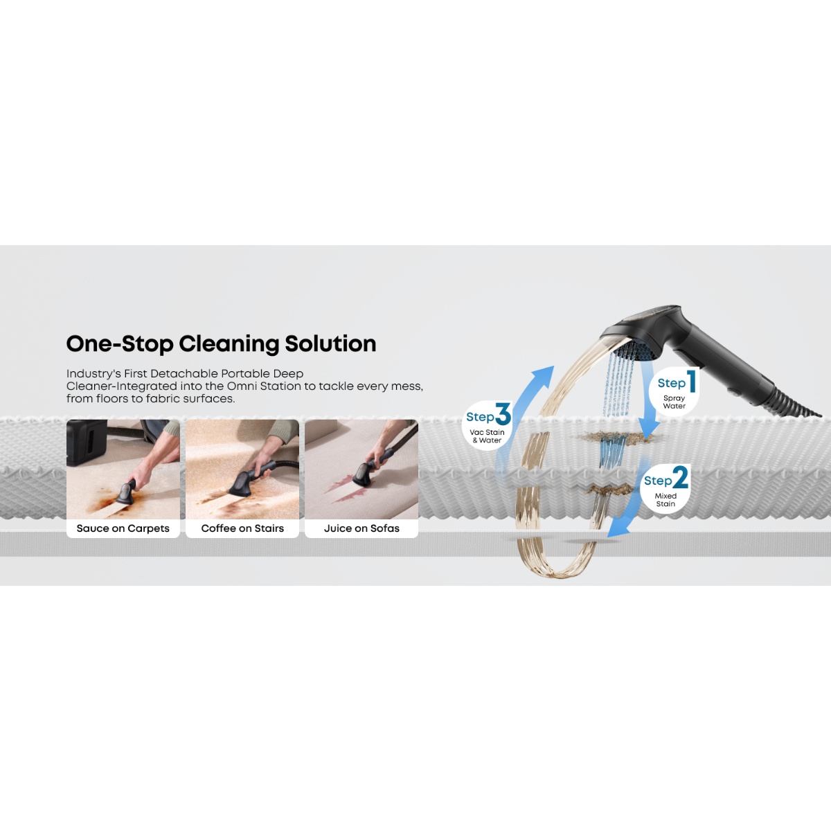 Posebna prednost Omni E28 modela je integrisani FlexiOne™ Portable Deep Cleaner. U stanici se nalazi odvojivi prenosivi uređaj za dubinsko čišćenje tepiha, stepenica, kauča i drugih tekstilnih površina. Na ovaj način Omni E28 postaje kompletno rešenje za čišćenje celog doma – podova i nameštaja.