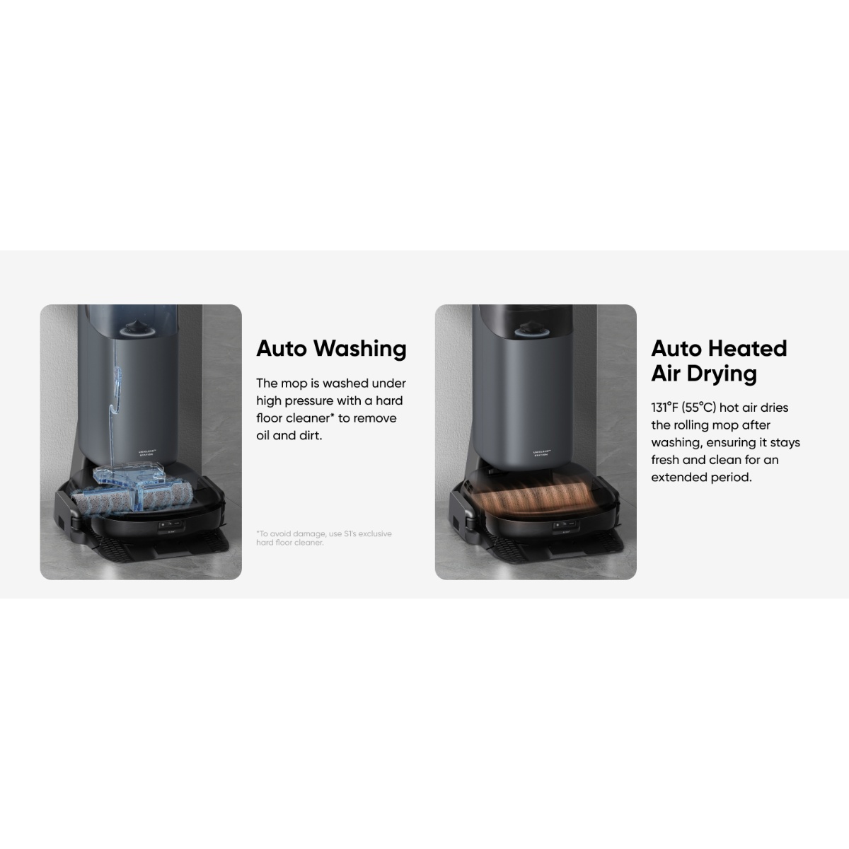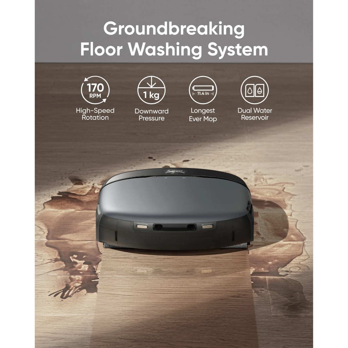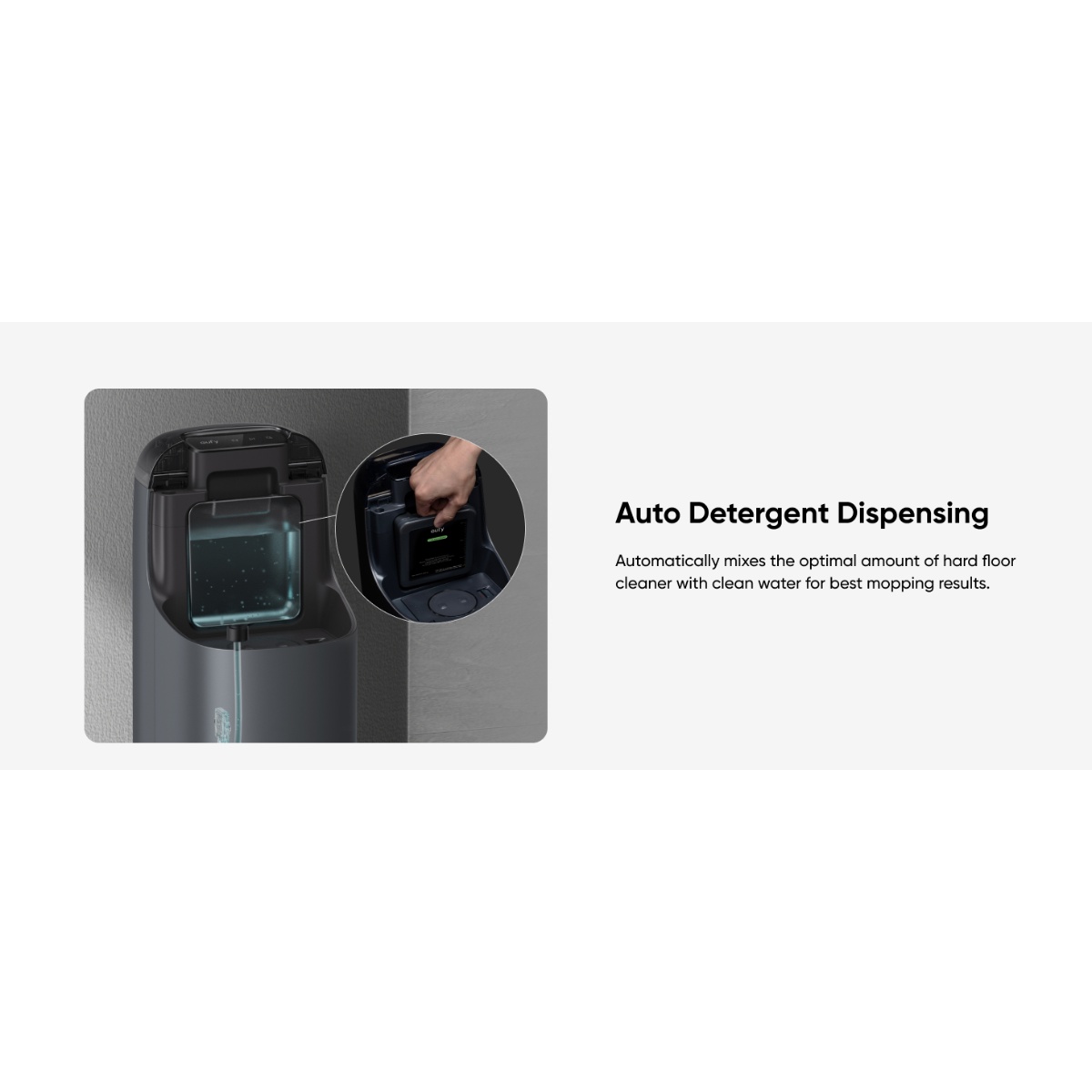 Always Clean Mop™ tehnologija rotira mop krpe uz visok pritisak i automatski se ispire, osiguravajući temeljito čišćenje bez razmazivanja prljavštine. Eco‑Clean Ozone™ sistem dodatno poboljšava dezinfekciju vode za pranje podova, pružajući higijenski čist pod čak i bez jakih hemijskih sredstava.
