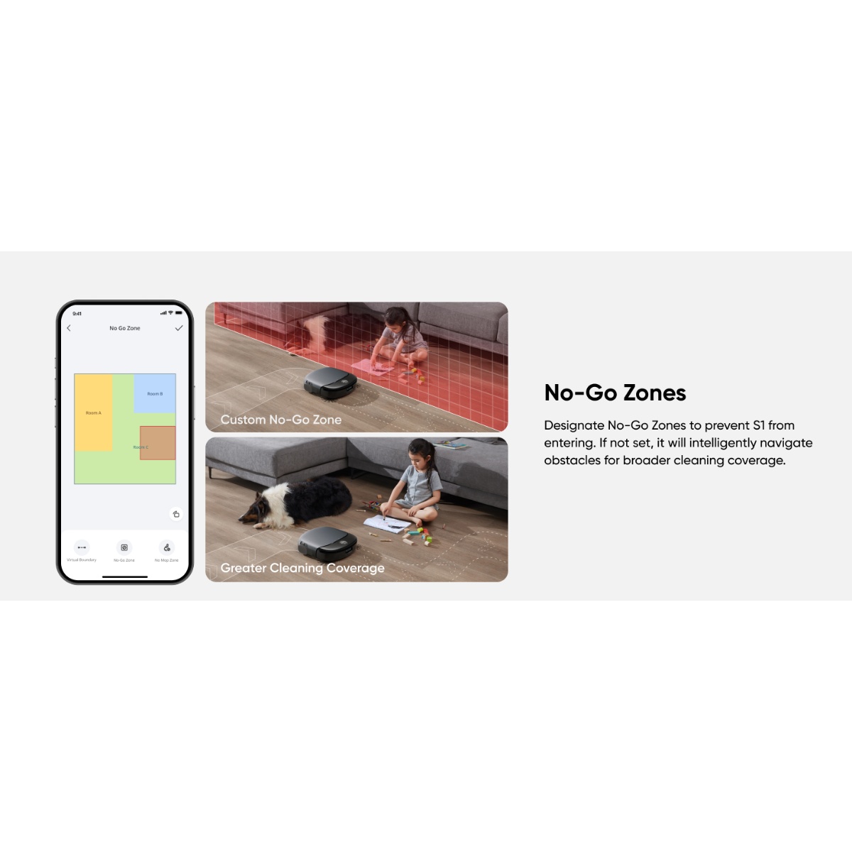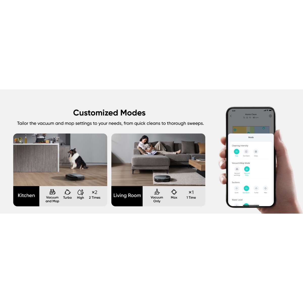 Snažno usisavanje od 8.000 Pa omogućava efikasno uklanjanje prašine, dlaka kućnih ljubimaca i čestica čak i sa tepiha i tvrdih podova. Robot automatski podiže mop kada detektuje tepih kako bi spriječio njegovo kvašenje, dok Corner‑to‑Edge kvadratni dizajn omogućava čišćenje teško dostupnih mjesta i uz zidove.