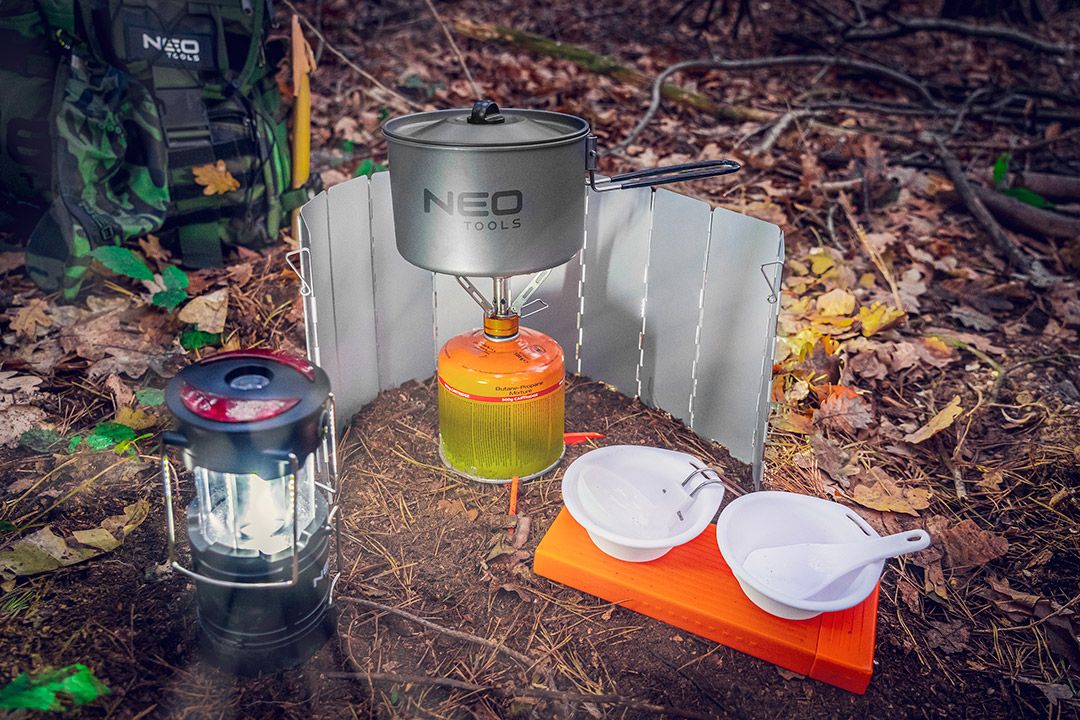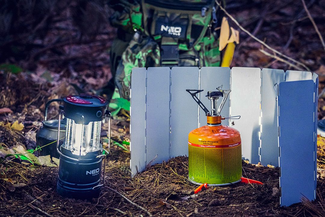 NEO lampa za kampiranje na baterije (ref. 99-030) je 3 u 1 proizvod – lampa, baklja i svjetlo upozorenja. Ima 3 funkcije osvjetljenja: baklja, lampa, crveno svjetlo upozorenja. Lampa je opremljena COB LED diodama sa svjetlosnim tokom od 200 lumena i snagom od 3W. Lampa ima proširivu strukturu i magnete u bazi. Osim toga, ima 2 ručke: bočnu i gornju, što povećava njegovu funkcionalnost. Napaja se sa 3 AA baterije (nisu uključene).