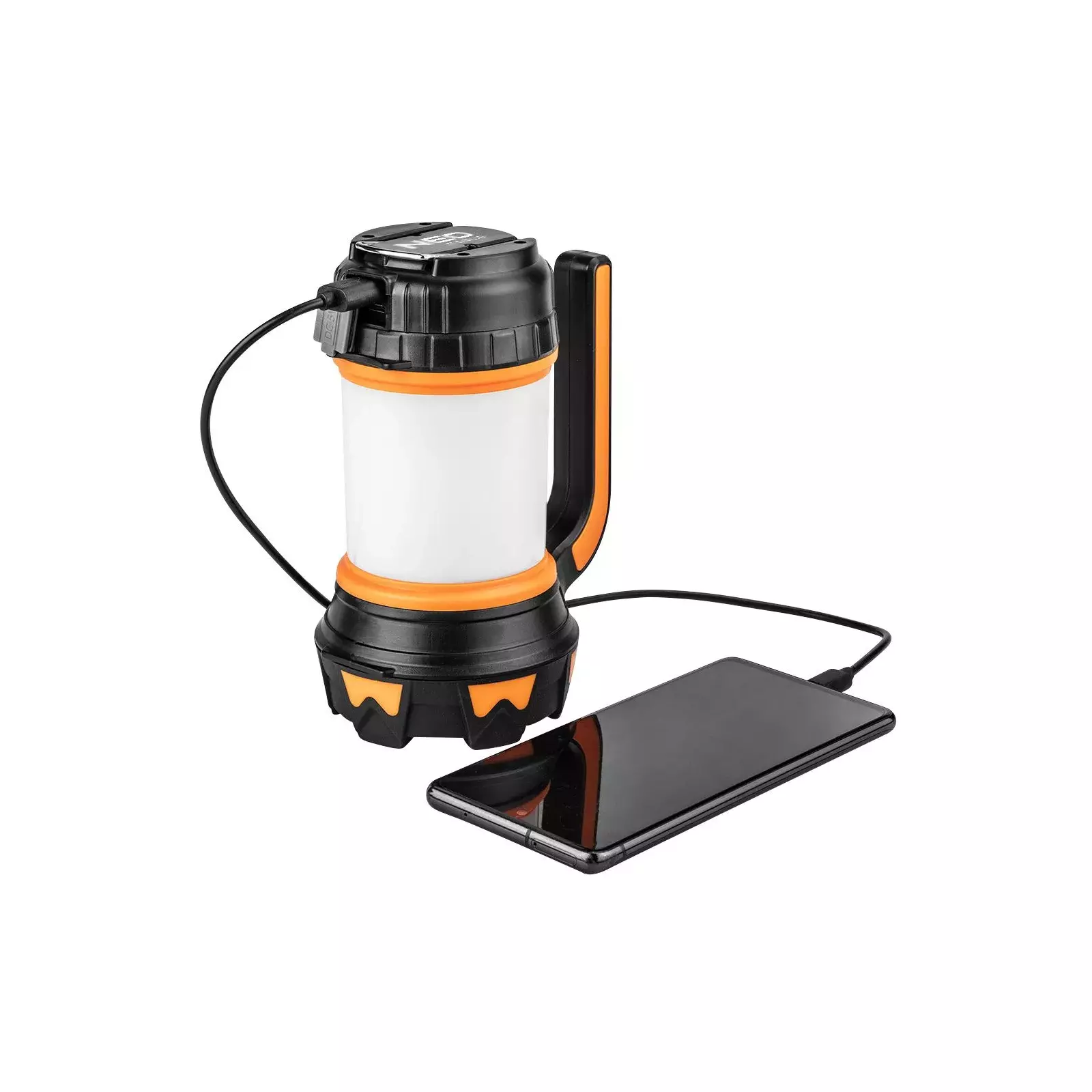 Punjiva kamperska lampa i powerbank 800 Lm 10 W NEO 99-031 dolazi uz 2 1200 mAh 3.7 Li-ion baterije i USB punjač. Vrsta svjetlosti je CRI T6 + SMD LED. Kamperska lampa ima 4 funkcije osvjetljenja: svjetiljka, bočno svjetlo, bočno crveno svjetlo i blinkavo bočno crveno svjetlo (stroboskop). Lampa posjeduje i kuku za lakše namještanje na šator. Vrijeme punjenja je 6h, dok je max. radno vrijeme 7h. Lampa se može koristiti i kao powerbank (eksterni punjač).
