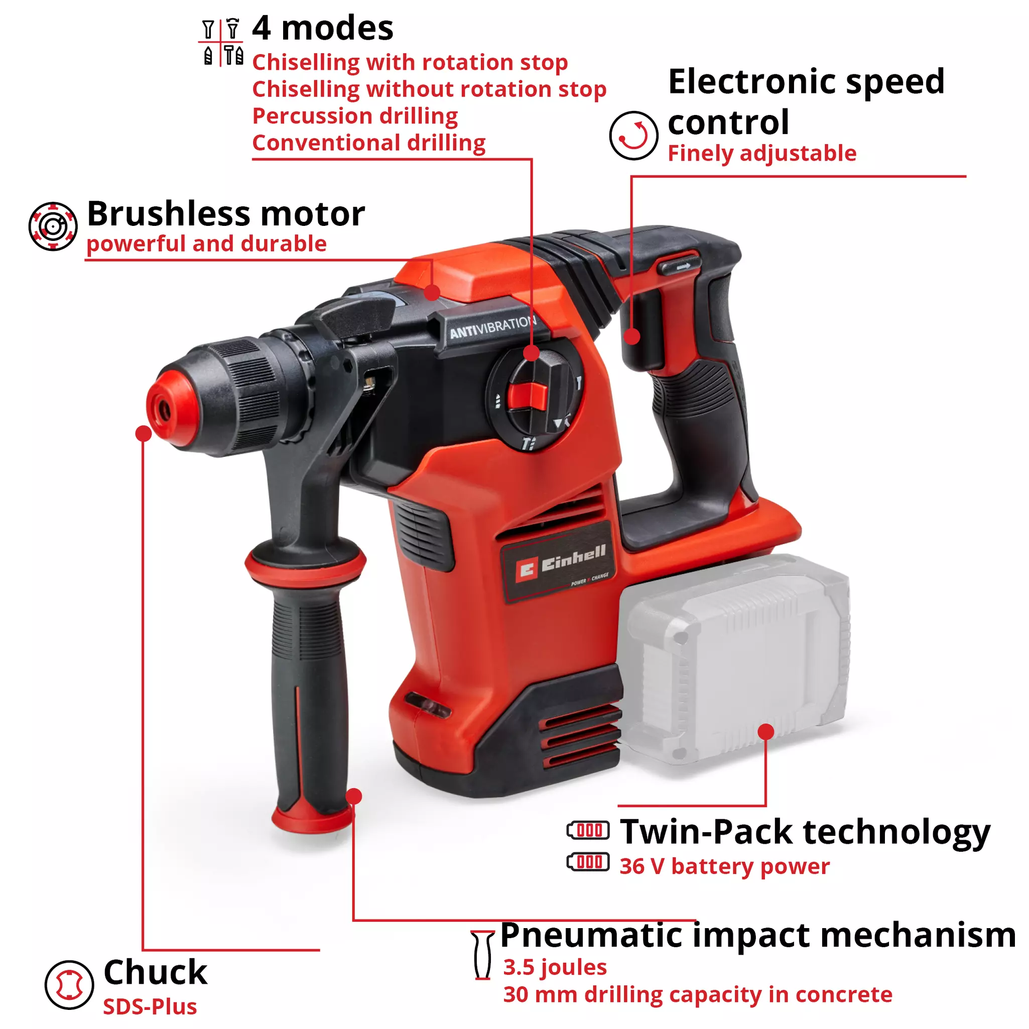 Einhell profesionalna akumulatorska bušilica TP-HD 36/30 Li BL +4 – Solo je svestrana bušilica koja se može koristiti u radionici i oko kuće. Kombinira četiri funkcije u jednom alatu: bušenje, bušenje čekićem i klesanje sa i bez zaustavljanja
