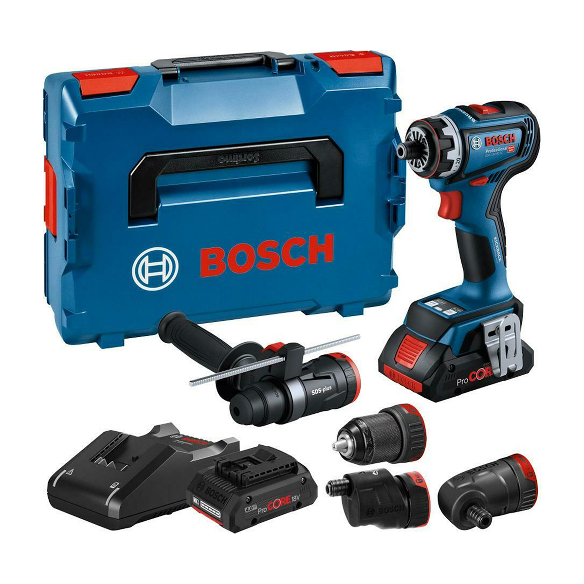 | Isporučeni pribor | 2 x baterija ProCORE18V 4,0Ah 1 600 A01 6GB Brzi punjač GAL 18V-40 Professional 1 600 A01 9RJ Čekić nastavak uključujući dodatnu ručku GFA 18-H Professional 1 600 A00 3NF Ekscentrični nastavak GFA 18-E Professional 1 600 A00 1SJ Graničnik dubine L-BOXX 136 1 600 A01 2G0 Metalna stezna glava za bušilicu GFA 18-M Professional 1 600 A01 3P6 Ugaoni nastavak GFA 18-W Professional 1 600 A01 3P7 Umetak za L-BOXX 136 |