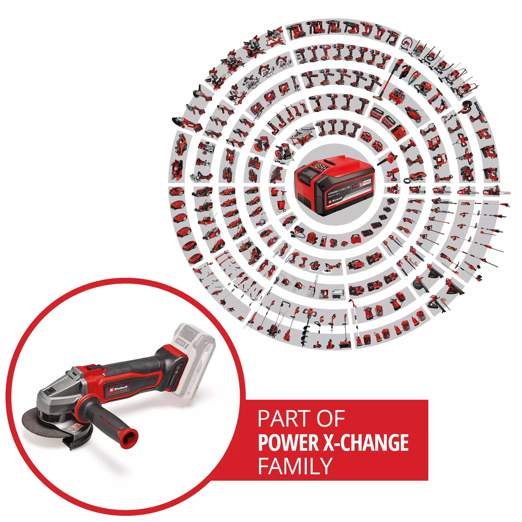 Einhell akumulatorska kutna brusilica TE-AG 18/115 Q Li Solo nudi bežičnu slobodu, bilo za brušenje, sječenje ili poliranje. Kao član porodice Power X-Change, baterije se mogu koristiti u preko 250 Einhell uređaja. Tanak dizajn sa ergonomskim mekim rukohvatom i dodatnom ručkom, koja se može fleksibilno postaviti u 2 položaja osiguravaju ugodan rad. Zbog razdvajanja motora i mjenjača, kutna brusilica uvjerava visokim nivoom glatkoće. Quick Fix matica omogućava brzu zamjenu diska bez alata bez ključa, štitnik diska sa brzim podešavanjem omogućava fleksibilan rad. Za maksimalnu sigurnost korisnika, akumulatorska brusilica je opremljena zaštitom od mekog pokretanja i ponovnog pokretanja. Ostale kvalitetne karakteristike uključuju zaštitu od preopterećenja i modifikovane zračne kanale za bolje hlađenje, izdržljivost i robusno aluminijsko kućište mjenjača. Za optimalne rezultate preporučuje se baterija od 2,5 Ah ili više. Disk za rezanje nije uključen u isporuku. Isporuka ne uključuje bateriju ili punjač. Oni su dostupni zasebno, npr. kao praktičan početni set.
