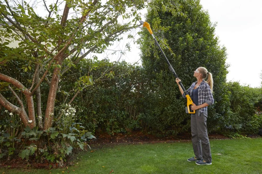 Jednostavno izvucite produžni stup od 55 cm na dužinu koja vam je potrebna – dostižući maksimalnu visinu od 2,75 m sa oštricom škara za živicu i 2,55 m sa pilom za rezanje.