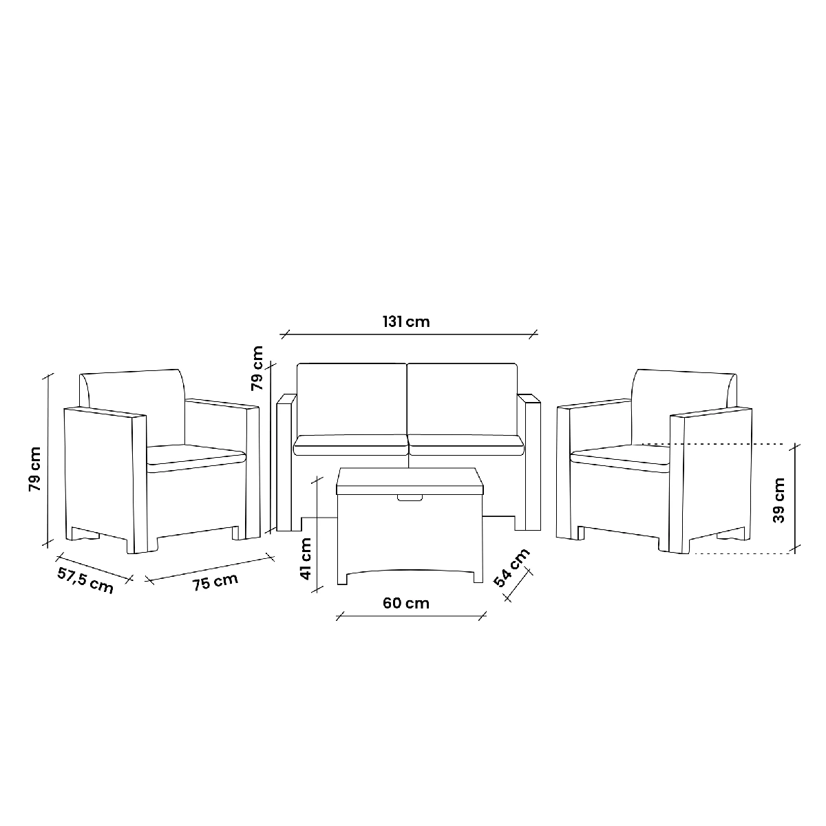 1 dvosjed – sofa; 1 stolić; 2 fotelje s visokim i ergonomskim naslonima; 4 jastuka; |