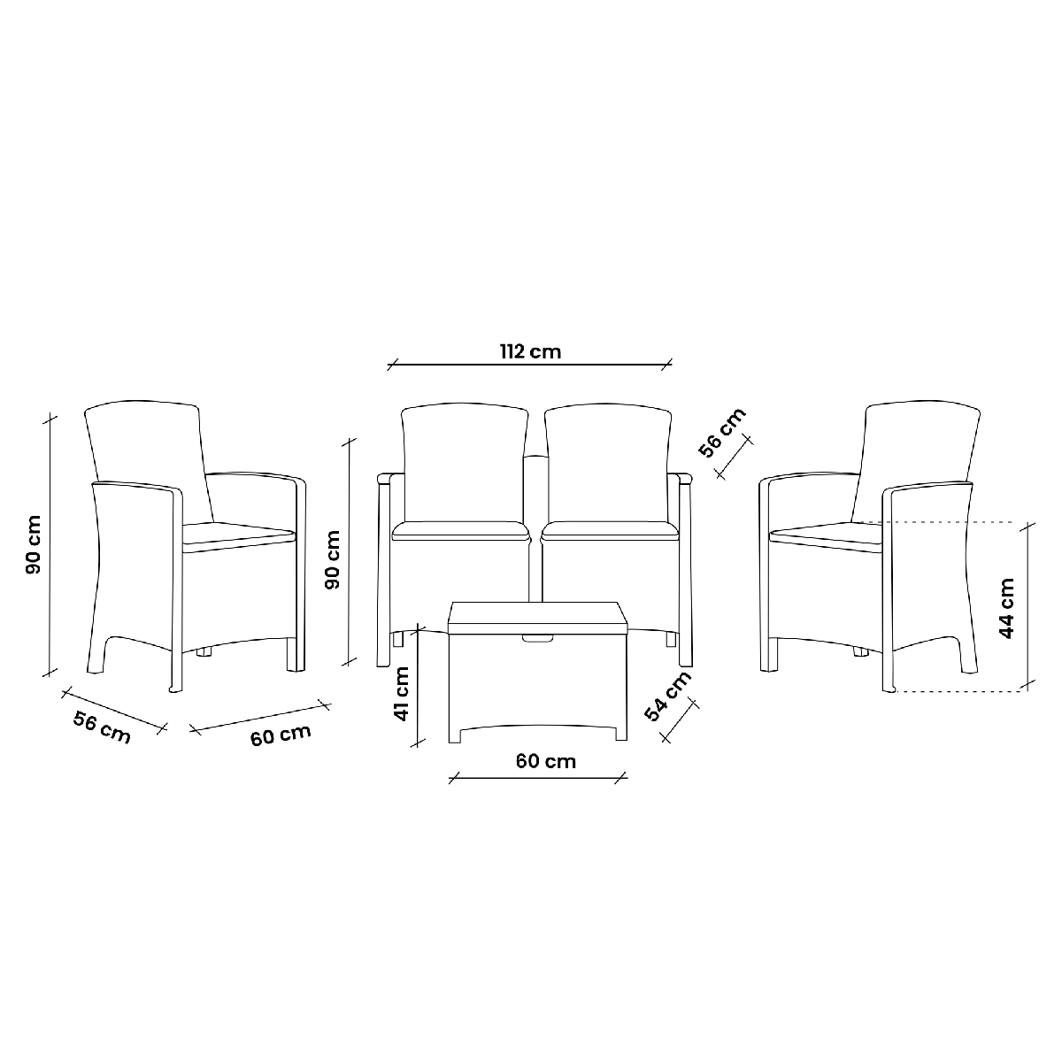 1x dvosjedna sofa; 1x sto za odlaganje jastuka; 2x fotelje sa visokim i ergonomskim naslonima; 4x jastuka; |