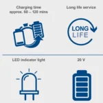 Inovativno upravljanje pojedinačnim ćelijama osigurava efikasno korištenje i maksimalno vrijeme rada litijum-jonskih ćelija. Minimalni rizik od prekomjernog i dubokog pražnjenja takođe produžava životni vijek trajanja baterije. Trenutni status punjenja se takođe može očitati na 3-stepenom LED displeju.Pogodan za sve IKSES 20 V seriju uređaja