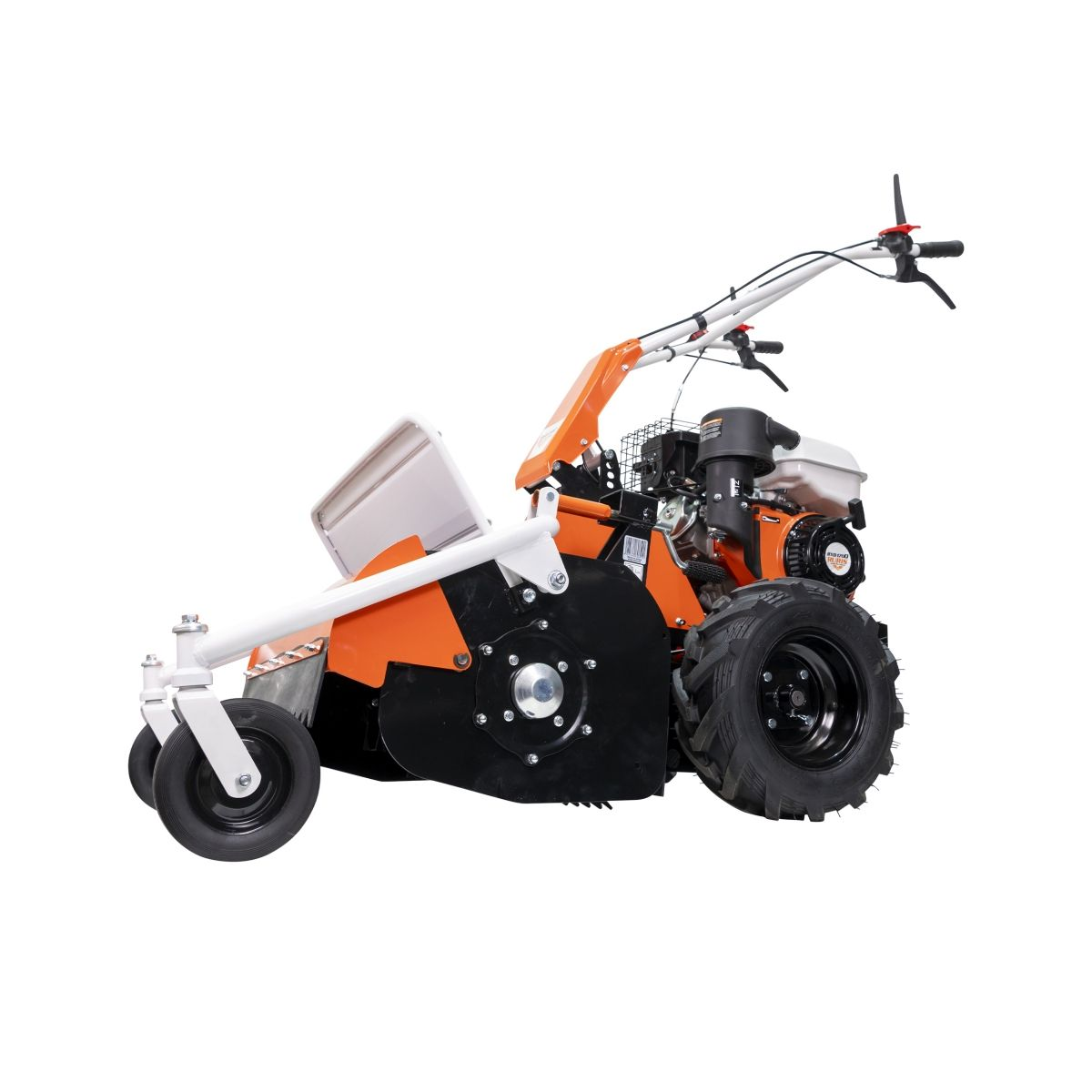Brzine: 3+1 Jedinica za rezanje: rotor sa 58 noževa u obliku slova "Y". Kvačilo: kaiš sa zatezačem Motor: HONDA GX 390 Noževi: Rotacioni sa 58Y noževa Prijenos: sa zupčanicima u uljnom kupatilu Radna kočnica: sa automatskim uključivanjem Snaga: 11,7 HP Širina košenje: 100 cm Težina: 203 kg Točkovi: Zadnji točkovi: 18/9.50-8", Prednji točkovi: okretni sa blokadom Upravljači: sa vertikalnim i horizontalnim podešavanjem Upravljanje: sa nezavisnim upravljačkim spojkama i blokadom kotača Visina košenje: 20-80 mm Zapremina: 389 cc Zemlja porijekla: Italija |