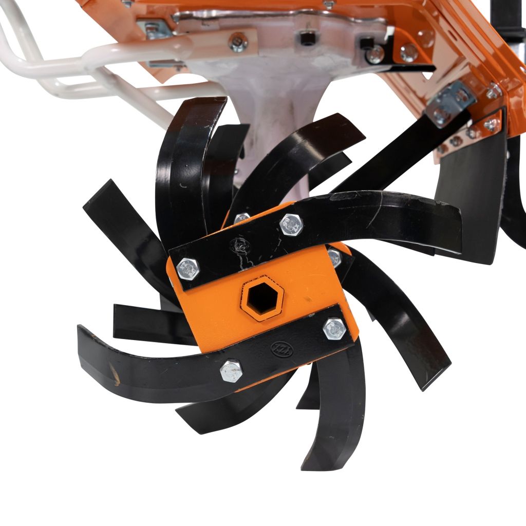 Konkavni oblik aktivnih noževa smanjuje udarce kada ih udari tlo, a transportni kotači pomažu u brzom i jednostavnom rukovanju prostorom za skladištenje u području upotrebe. Zahvaljujući robusnim i preciznim noževima za rezanje, rezanje zemlje je vrlo jednostavno. Budući da je tako jednostavan za korištenje, svaka osoba, čak i bez iskustva, imat će zagarantovan uspjeh u bašti, staklenicima ili solarijumima.