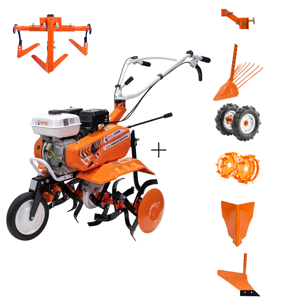 DAC 7000K poluprofesionalna kopačica omogućava priključivanje širokog spektra dodataka kao što su: plug s brazdom, iskopavač kanala, vađač krompira, kultivator, ploča za snijeg, bubanj za košenje, sijačice, metalni ili gumeni točkovi, te prikolica nosivosti do 500 kg.