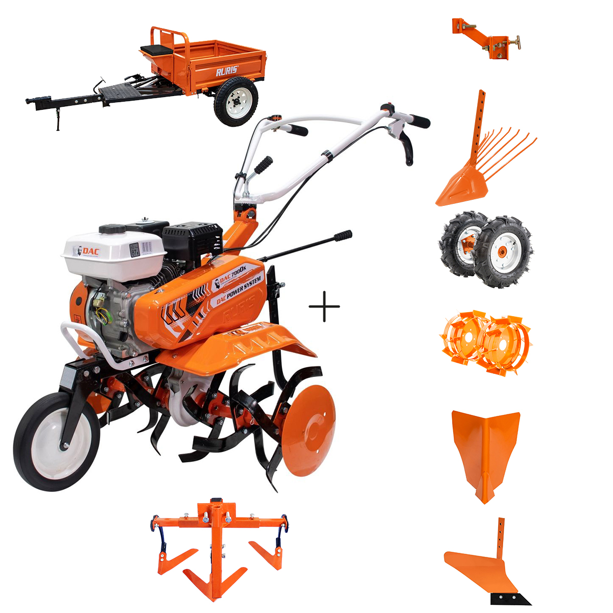 DAC 7000K poluprofesionalna kopačica omogućava priključivanje širokog spektra dodataka kao što su: plug s brazdom, iskopavač kanala, vađač krompira, kultivator, ploča za snijeg, bubanj za košenje, sijačice, metalni ili gumeni točkovi, te prikolica nosivosti do 500 kg.