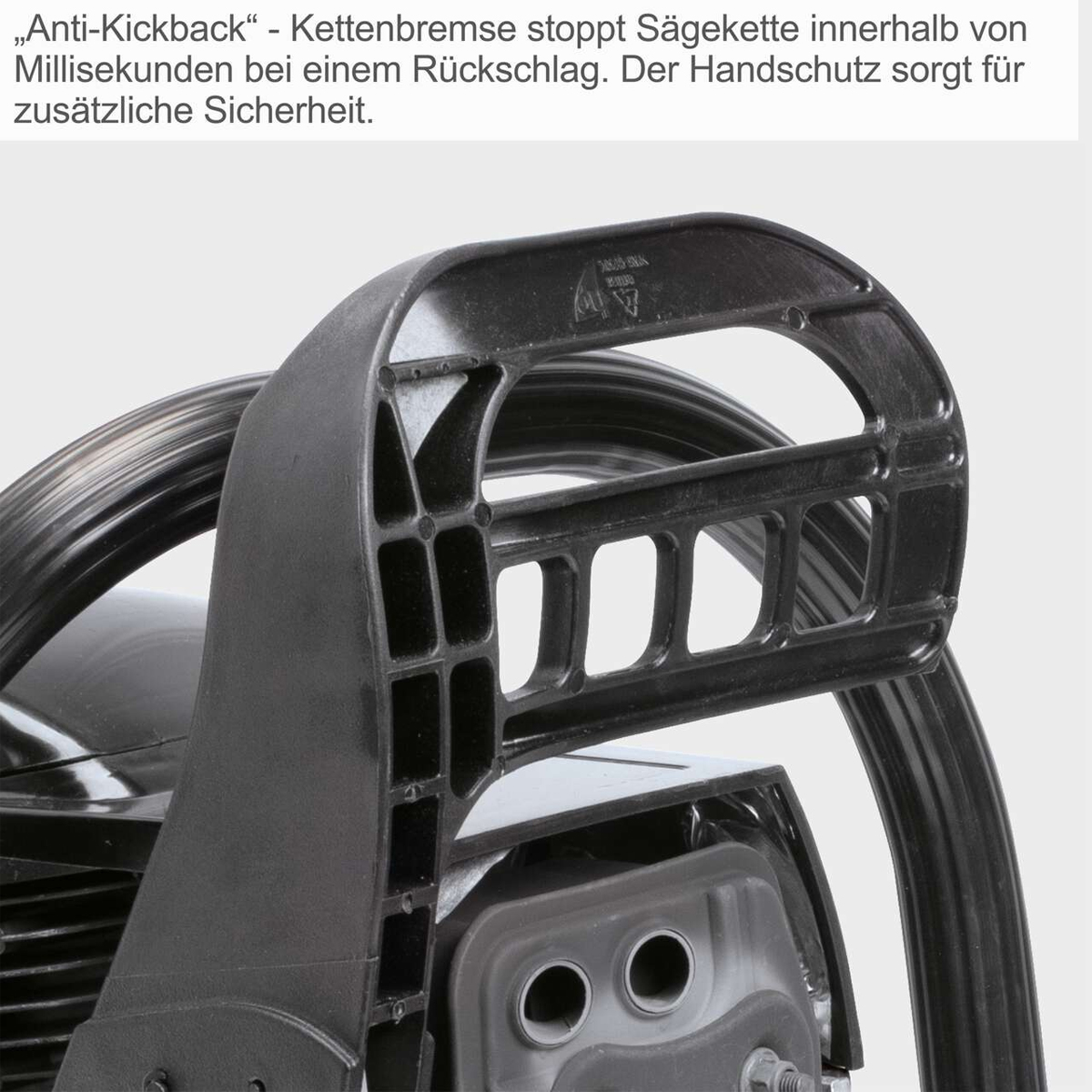 Osim jednostavnog rukovanja, važan je i visok stepen sigurnosti tokom rada. Štitnik za prednju ruku štiti lijevu ruku operatera ako sklizne s prednje ručke dok motorna pila radi. Prednji štitnik također aktivira kočnicu lanca, koja zaustavlja lanac u roku od nekoliko milisekundi u slučaju povratnog udarca.
