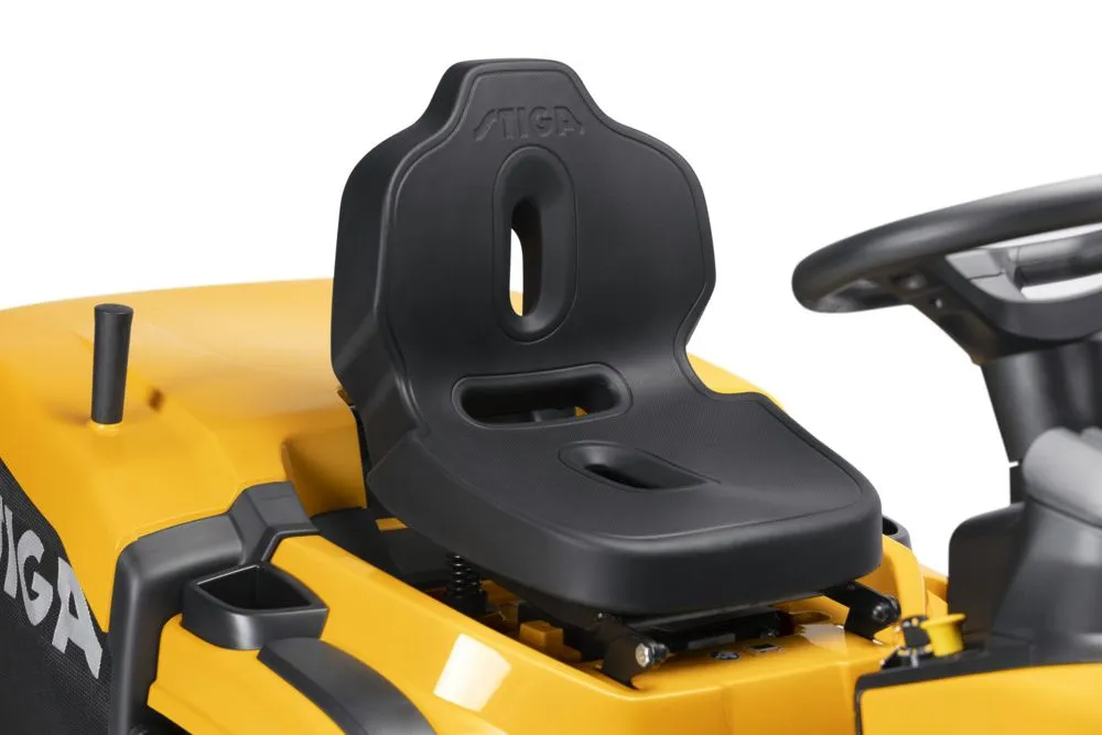 Također ćete uživati u snažnim, ali energetski efikasnim LED prednjim svjetlima koja olakšavaju sigurnu košnju pri slabom osvjetljenju; podignut volan za izvrsnu udobnost operatera; i bez napora elektromagnetsko uključivanje oštrice. T A STIGA Ergonomski volan radi sa STIGA Classic podesivim sjedištem sa visokim naslonom kako bi ga učinio užitkom za vožnju.