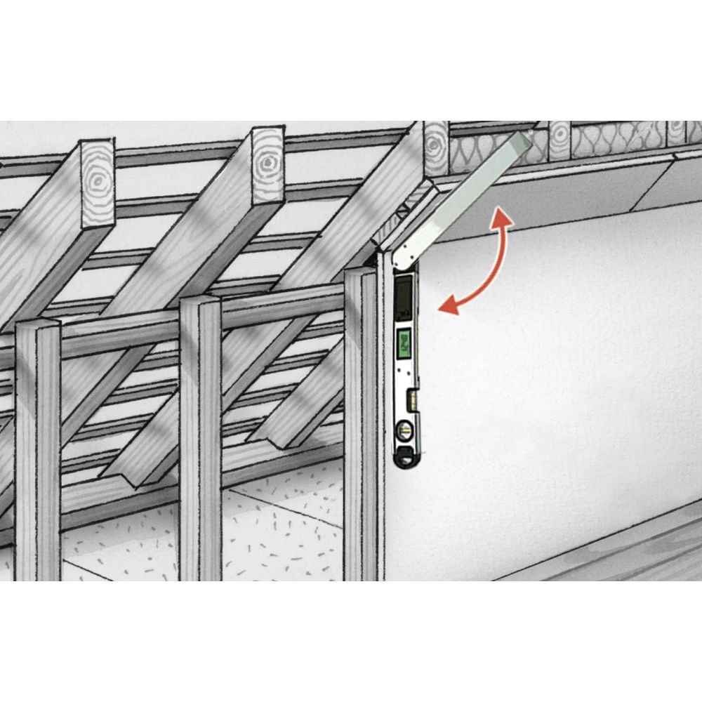Opis: Unutarnji i vanjski kutovi mogu se precizno odrediti digitalnim elektroničkim uređajem za mjerenje kutova, na primjer pri mjerenju kutova krova ili ugradnji namještaja ili prozora. Osvijetljeni zaslon sprijeda i straga prikazuje izmjerenu vrijednost velikim znamenkama i prikazuje ih na odgovarajući način pri mjerenjima iznad glave. Proširiva kosina za upotrebu na teško dostupnim mjestima. Funkcija zadržavanja omogućuje kasnije očitavanje zaslona kada se koristi na nepristupačnim mjestima.