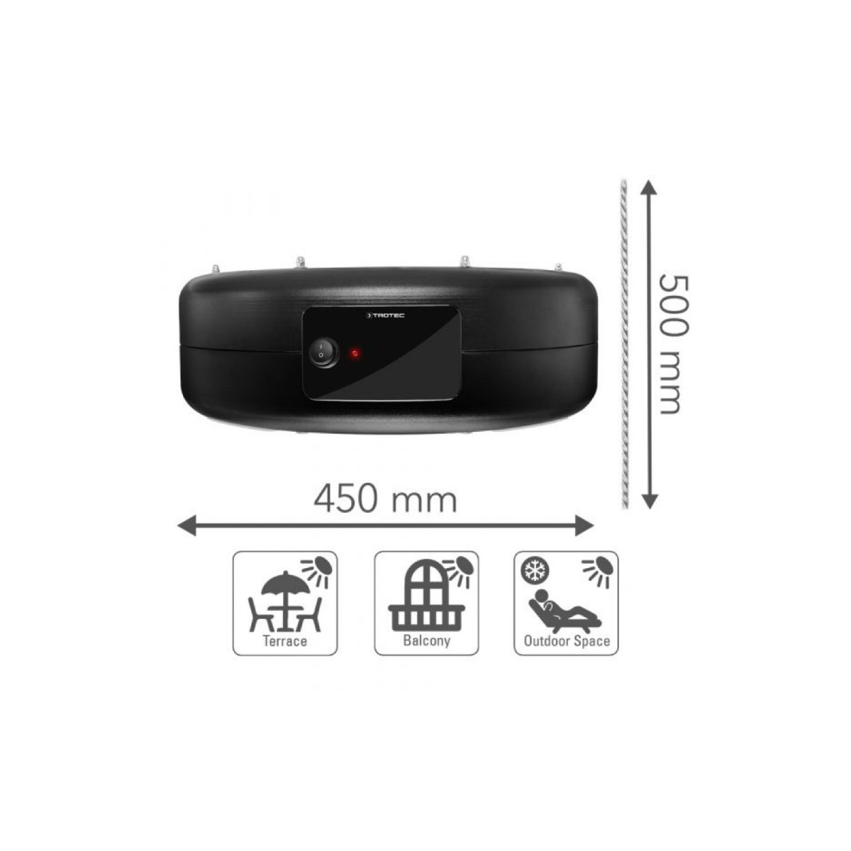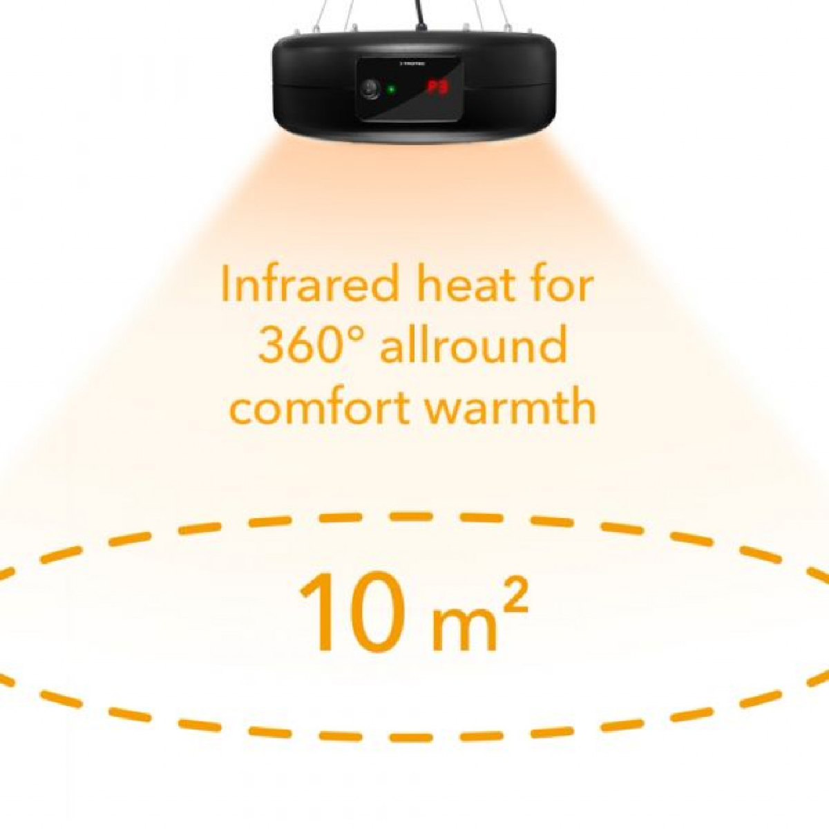 Toplina od 360° koja zrači prema dolje iz reflektorskog kišobrana velikog 45 cm može se osjetiti na površini od 10 m². Za razliku od konvencionalnih konvektora, IR 1550 SC zagrijava kožu izravno, a ne zrak iz okoline. Infracrvenu toplinu, koja je posebno ugodna, koža odmah apsorbira i pohranjuje. Zahvaljujući ovom aktivnom principu, IR 1550 SC zagrijava osjetno intenzivnije i energetski učinkovitije od ostalih tehnologija grijanja – i bez neugodnih mirisa ili zvukova. Grijač, težak oko 3,5 kg, pričvršćen je na strop s četiri čelična užad za pričvršćivanje (zatezna žica) koja su uključena u isporuku. Mreža s bliskim mrežama štiti grijaće šipke od radoznalih dječjih prstića i slučajnih dodira.