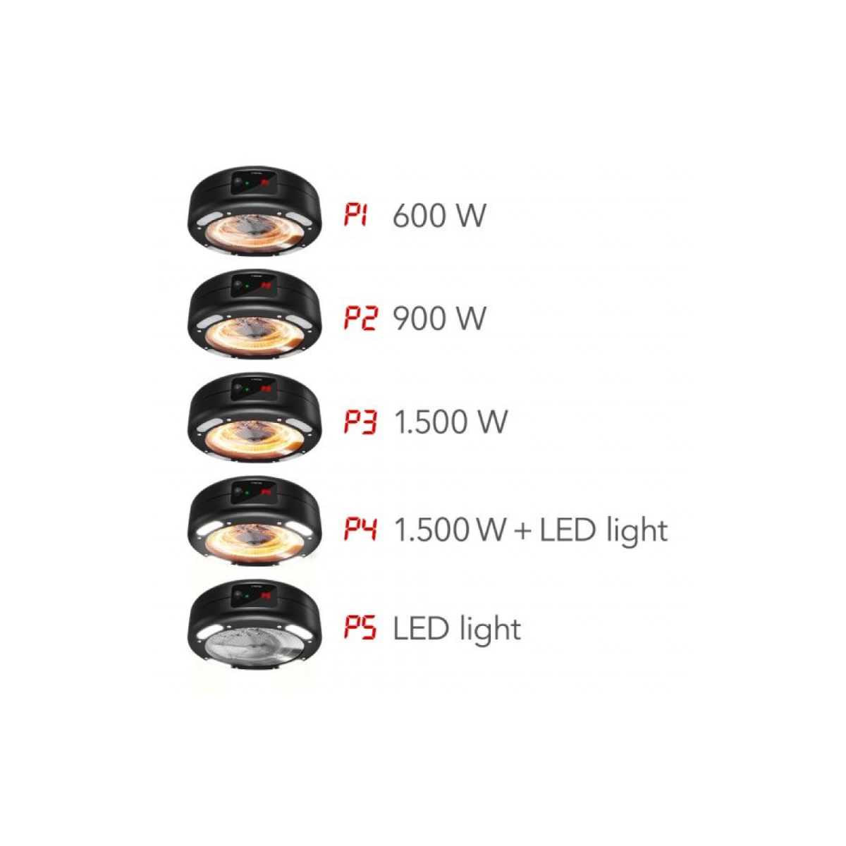 Dvije halogene cijevi visokih performansi s tri razine grijanja (600 W / 900 W / 1500 W) uvijek isporučuju onoliko korisne trenutne topline koliko mjesto i namjena zahtijevaju. Po potrebi se mogu uključiti četiri svijetle LED reflektore (može se koristiti i bez aktiviranog grijanja), pri čemu se stropni grijač pretvara u funkcionalnu radnu svjetiljku ili moderan dodatak. Razine grijanja i načini rada biraju se jednostavno i praktično pomoću praktičnog infracrvenog daljinskog upravljača.