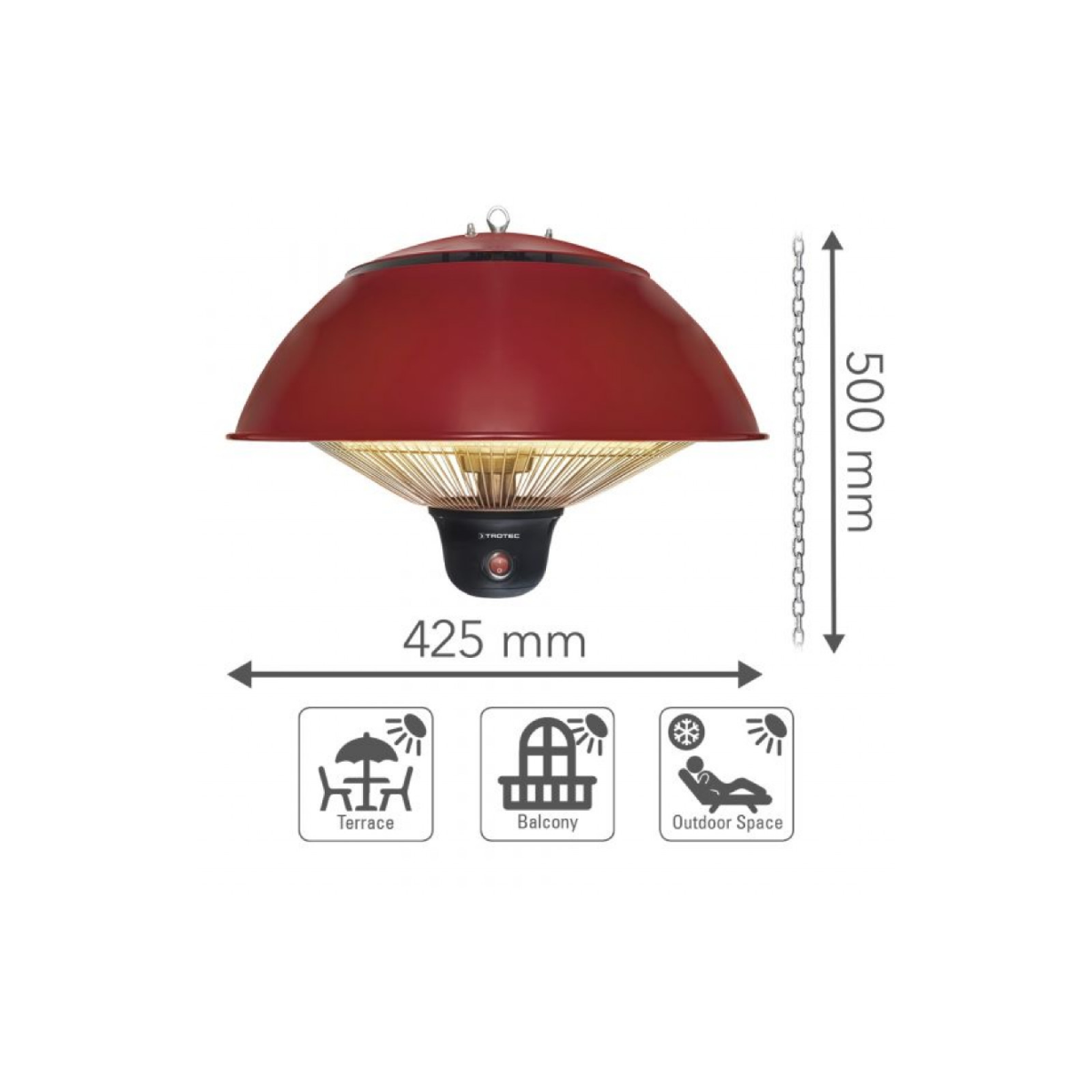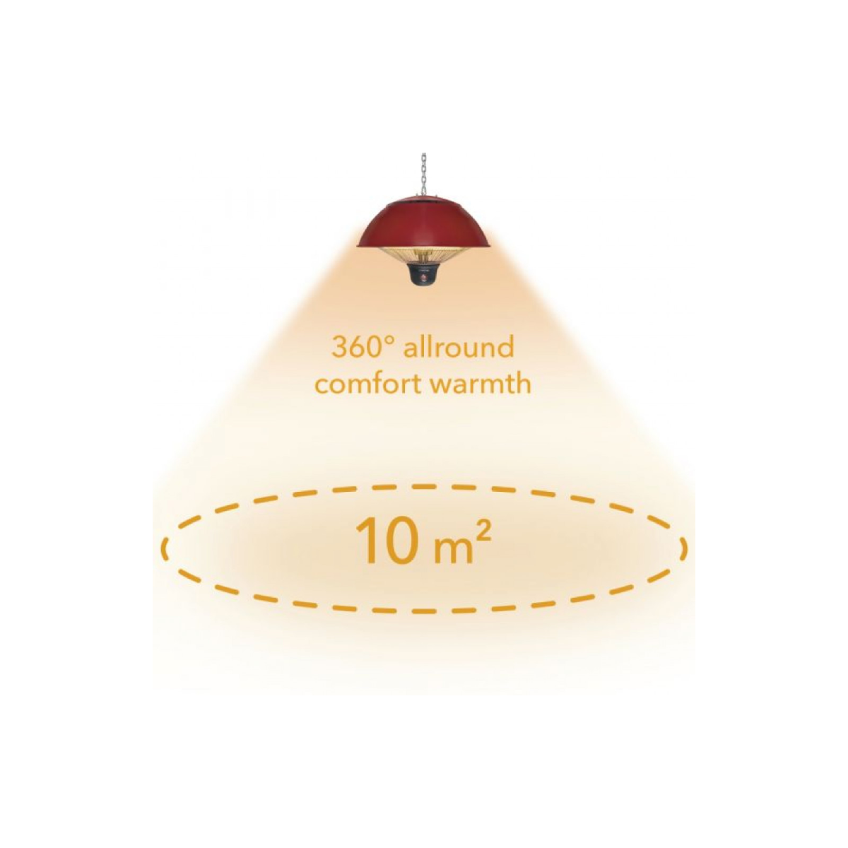 Veliki reflektor (42,5 cm) modernog stropnog reflektora opskrbljuje površinu do 10 m² ravnomjerno zračenom 360 ° svestranom toplinom, koja se odmah primjećuje na koži i površinama. Budući da infracrvene grijalice, za razliku od radijacijskih grijača s plinskim radom i plamenom, prvo ne zagrijavaju okolišni zrak, ugodna infracrvena toplina odmah pronalazi svoje odredište, čak i po jakom vjetru – i bez neugodnih mirisa ili buke. Ovim principom rada, infracrveni grijač zagrijava se sa 100% niskim emisijama i znatno više uštede energije od ostalih tehnologija grijanja. Jedini svjetlosni stropni reflektor od 2,5 kg može se u nekoliko jednostavnih koraka postaviti na strop, krovove terase ili skele u nekoliko jednostavnih koraka pomoću lanca od nehrđajućeg čelika duljine 50 cm koji je uključen u isporuku, bez potrebe za tehničarom. Rešetka s bliskim mrežama štiti šipke za grijanje od znatiželjnih dječjih prstiju i slučajnih dodira. Najbolji uvjeti za uživanje u još više vremena i dugim večerima na otvorenom s voljenim osobama ili prijateljima – istovremeno s ugodnim ljetnim temperaturama.
