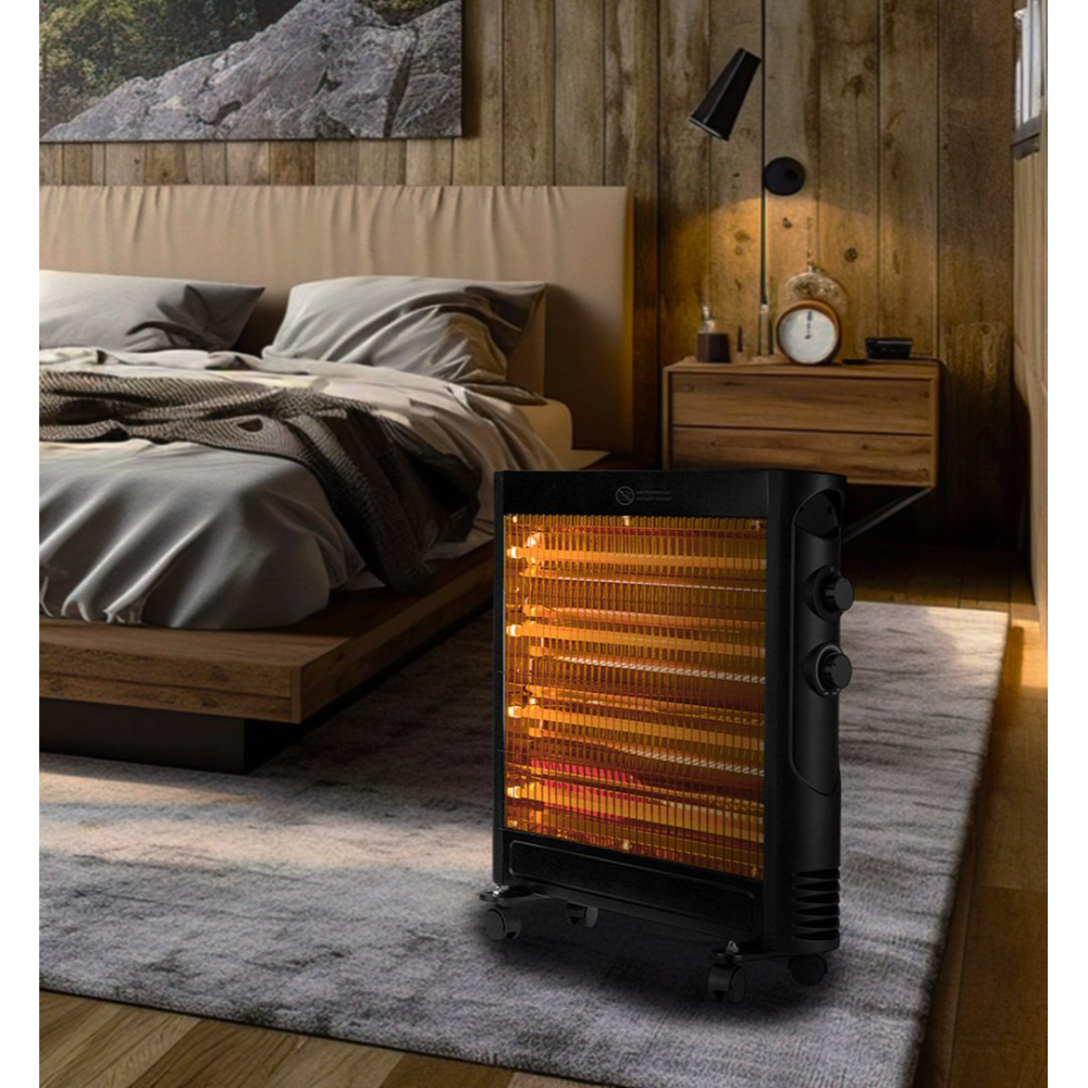 Kvarcni infracrveni grijač 600/1200 W 90-111 NEO je uređaj za brzo i efikasno grijanje prostorija. Zahvaljujući četiri kvarcne cijevi, koje su efikasni grijaći elementi, i integriranom termostatu, infracrveni grijač pruža trenutnu toplinu bez potrebe za dugim zagrijavanjem zraka. Radi tiho – neuporedivo s grijačima ili ventilatorima, što ga čini savršenim za osobe osjetljive na buku. Njegova energetska efikasnost u usporedbi s tradicionalnim električnim sustavima grijanja, kao i mogućnost podešavanja veće i niže snage, minimiziraju troškove električne energije.