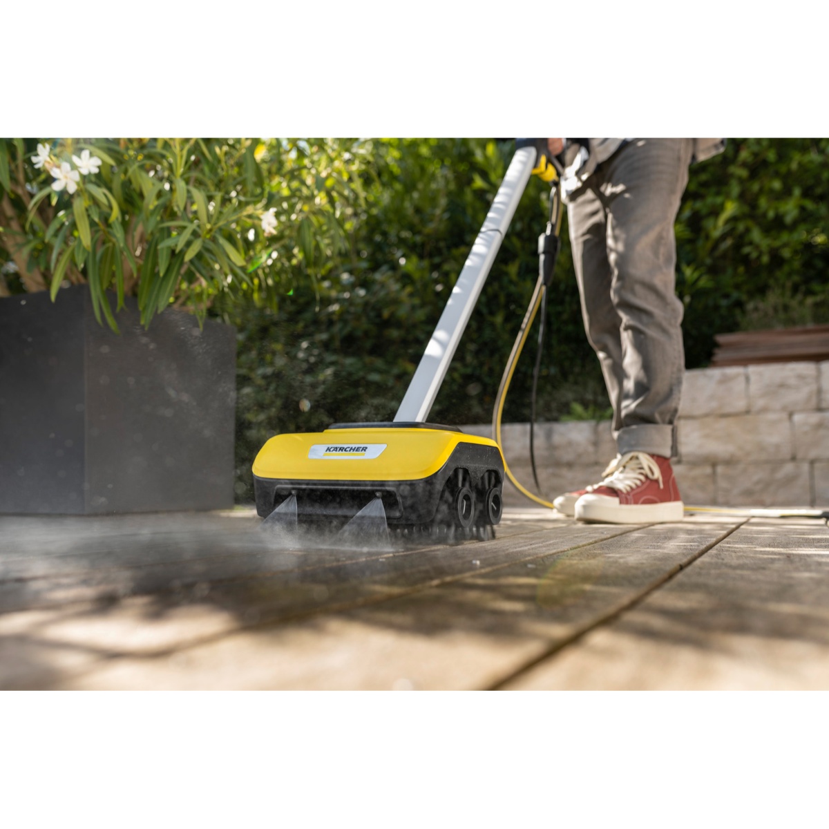 Električni PCL 6 može se koristiti za izuzetno jednostavno, ravnomjerno, brzo i temeljito uklanjanje tvrdokorne prljavštine s drvenih terasa. Jednostavno spojite uređaj na vrtno crijevo – i spremni ste za početak čišćenja. Zahvaljujući kombinaciji četiri rotirajuće valjkaste četke i podesivom dovodu vode, prljavština se može brzo i pouzdano navlažiti, a istovremeno se može pokupiti i odvesti. Svojim plutajućim efektom, PCL 6 osigurava temeljito i bez napora čišćenje drvenih ili WPC terasa. Koristi se samo onoliko vode koliko je potrebno. Širina i položaj valjaka dizajnirani su tako da se dvije daske mogu očistiti do ruba u jednom koraku, što također štedi vrijeme. Zahvaljujući zamjenjivim valjcima, možete čistiti ne samo drvene i WPC podne obloge, već i glatke i fino porozne kamene pločice i ploče. Valjkaste četke za kamene površine nisu uključene u opseg isporuke.