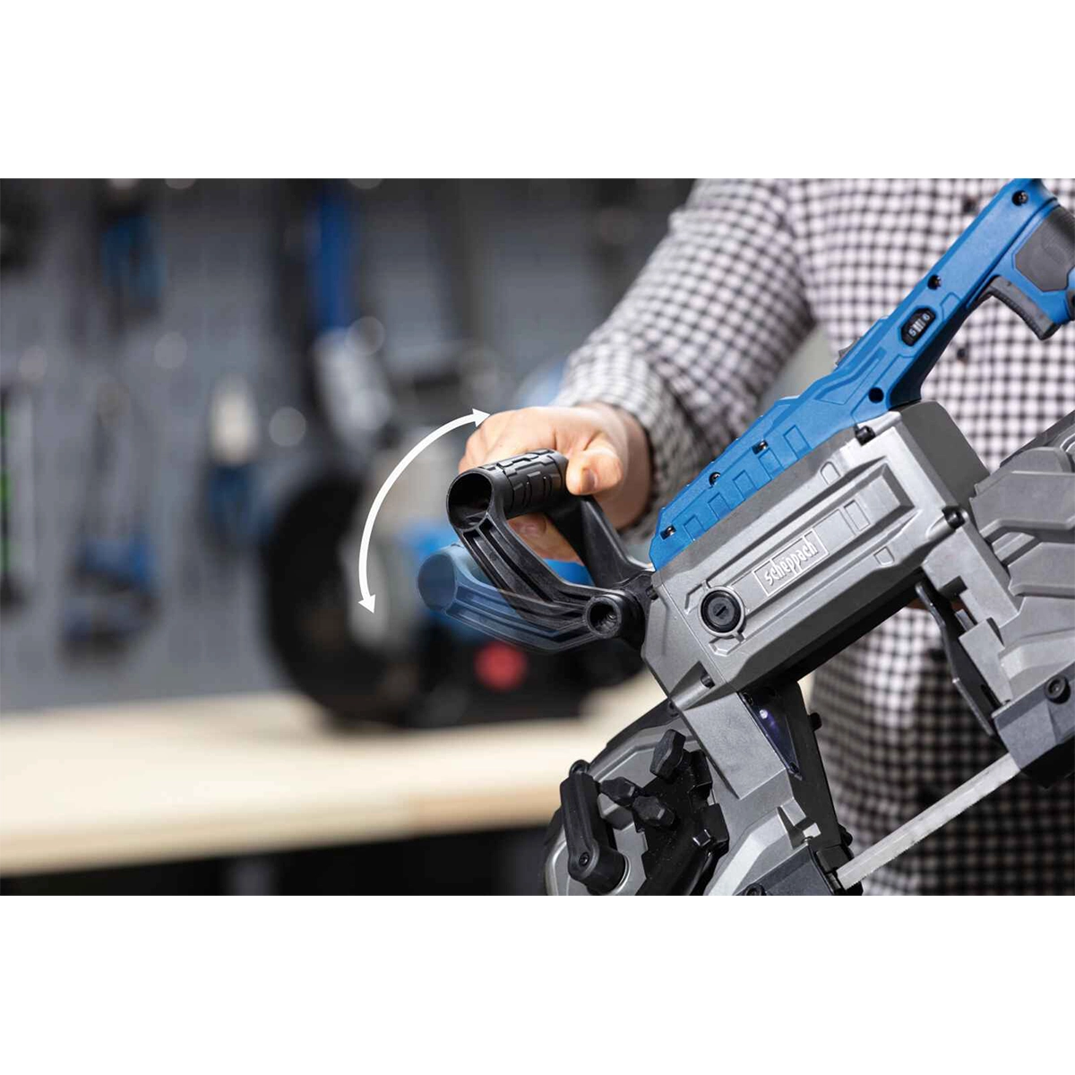 Za korištenje bez ruku, MBS1200 ima dvije izolirane udobne ručke tako da pila uvijek udobno i prije svega sigurno leži u vašoj ruci. Prednja ručka je pojedinačno podesiva za udoban položaj ruke. Lagana i praktična, tračna pila za metal može se fleksibilno koristiti, na primjer na gradilištu, u radionici ili u poljoprivredi, za skraćivanje cijevi i drugih već ugrađenih radnih komada.