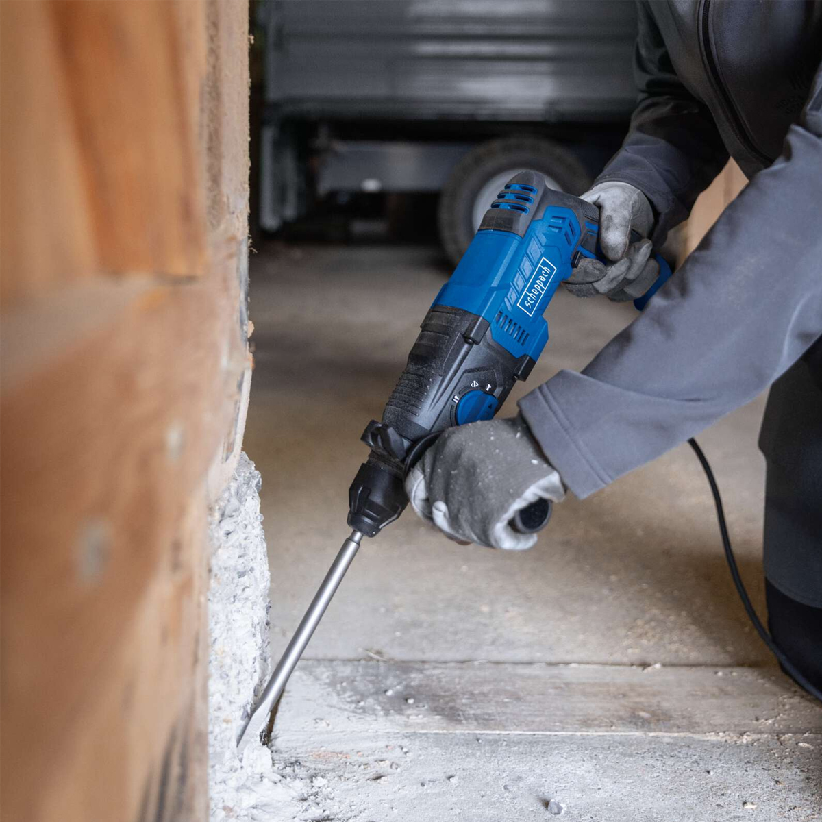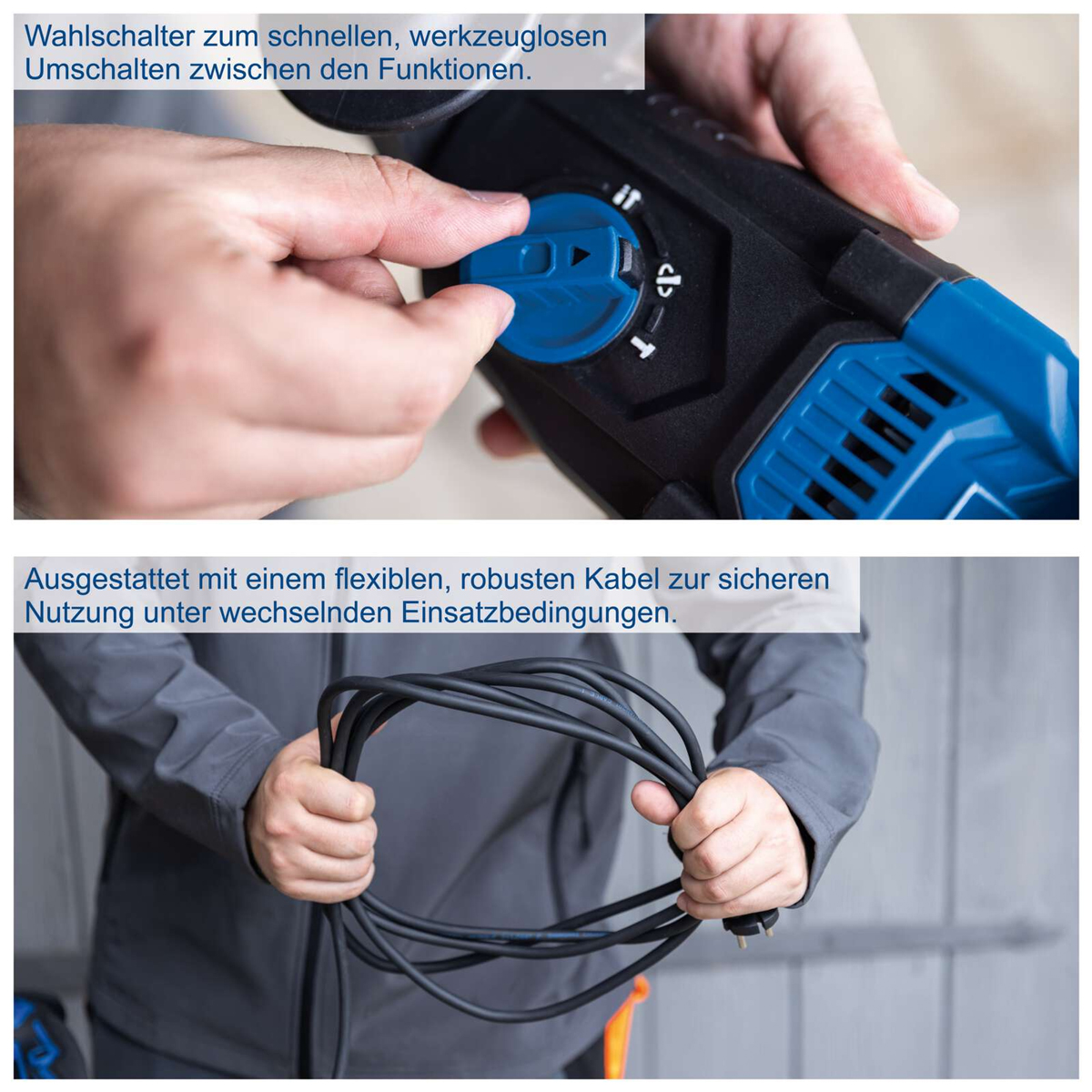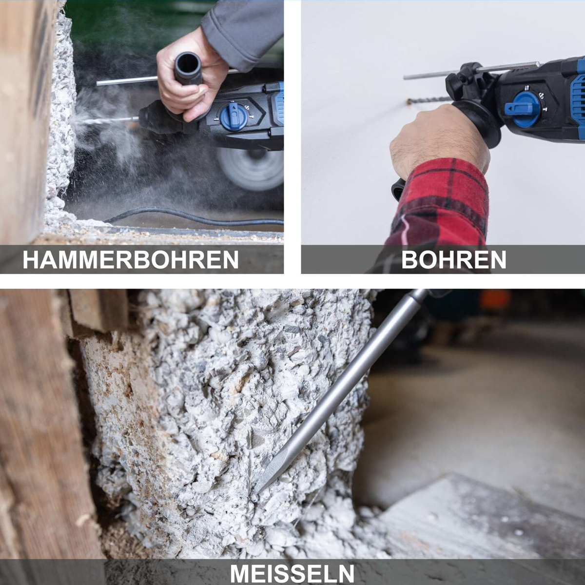 Snažna Scheppach električna udarna bušilica DH2260 s praktičnom 4-u-1 funkcijom idealna je za zahtjevne radove na kamenu, betonu, pločicama i cigli. Putem centralnog prekidača moguće je brzo i bez alata odabrati jednu od četiri funkcije rada.