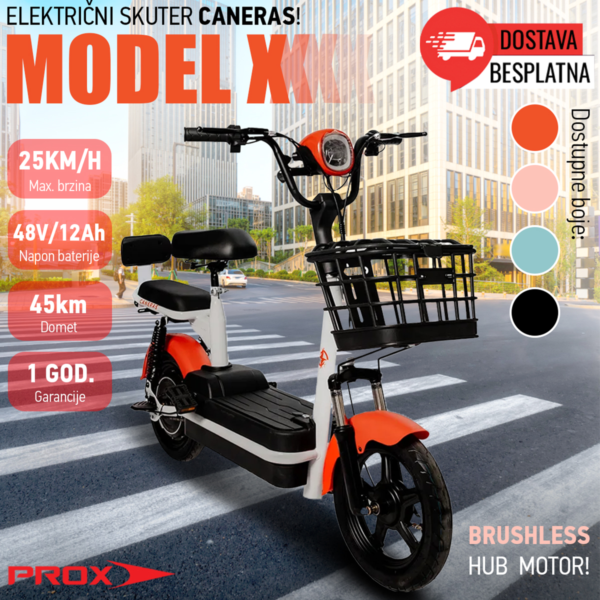 Caneras model X je svestrani električni bicikl i električni skuter, idealan za gradske vožnje i svakodnevnu upotrebu. Sa baterijom od 12 Ah, omogućava domet do 45 km sa jednim punjenjem. Maksimalna brzina od 25 km/h i 3 brzine pružaju odličnu kontrolu i sigurnost. Opremljen brushless hub elektromotorom, LED farovima, korpom, sirenom i dodatnim sjedištem sa naslonom, Caneras X donosi spoj udobnosti i funkcionalnosti. Visina sjedišta se podešava (62-104 cm), a klirens od 12 cm omogućava lagano kretanje i po neravninama. Bez potrebe za registracijom.