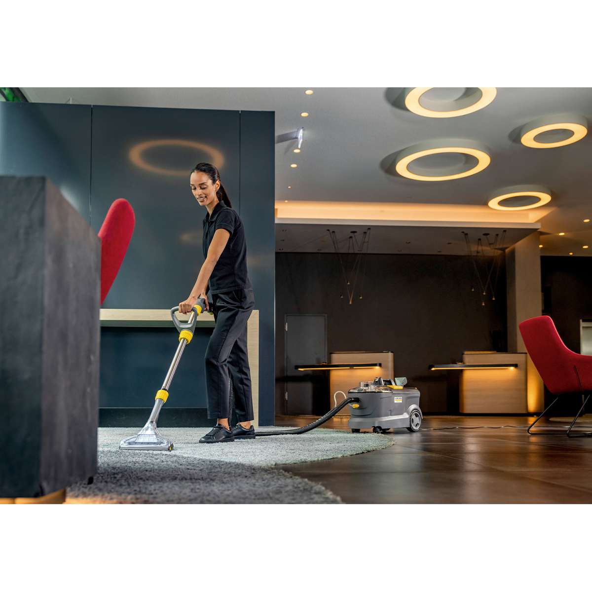 Puzzi 10/1 s mlaznicom za tapecirane površine i mlaznicom za pod posebno je prikladan za higijensko i učinkovito čišćenje manjih do srednje velikih površina. S tlakom prskanja od 1 bar ovaj uređaj s ekstrakcijom spreja osigurava dubinsko čišćenje tekstilnih površina uz očuvanje tkanine te daje uvjerljive rezultate, posebice kod čišćenja tapeciranih površina i čišćenja tepiha. Zahvaljujući uskoj mlaznici za pod, uređaj je također optimalno prikladan za primjenu u skučenim prostorima. A zbog fleksibilne usisne trake moguće je bez problema očistiti i vrlo zatrpana područja. Uređaj s ekstrakcijom spreja opremljen je integriranom kvačicom za kabel kao i fiksiranjem ručnog alata i usisne cijevi.