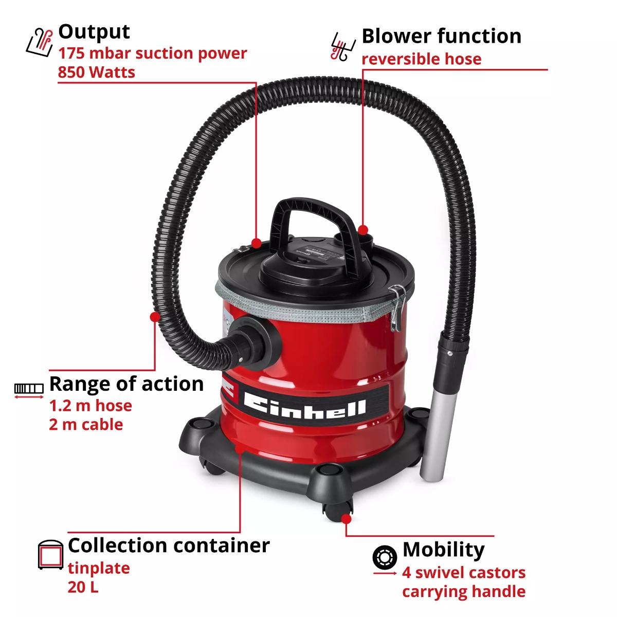 Maksimalna usisna snaga od 175 mbar osigurava efikasno uklanjanje pepela i fine prašine. Zahvaljujući praktičnoj ručki za nošenje i četiri okretna kotačića, usisivač je mobilan, fleksibilan i jednostavan za transport.