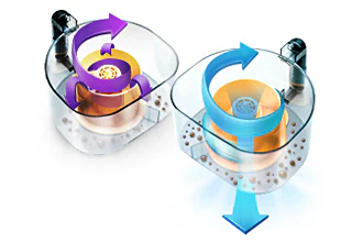 Samsungov jedinstveni dvokomorni sistem TM razdvaja normalnu komoru za prašinu u dva dijela što omogućuje bolje čišćenje i dugotrajnu snagu. Kada se jakom usisnom snagom vrši cirkulacija čestica kroz ciklonsku zračnu putanju unutrašnje komore, prašina i otpaci se odvajaju od zraka. Usljed toga, veće čestice prašine se filtriraju u vanjsku komoru sve dok ne budete željeli da ih izbacite. Što također znači da Samsung dvokomorni usisivači ne trebaju beskorisne, prljave i skupe zamjenske vrećice.