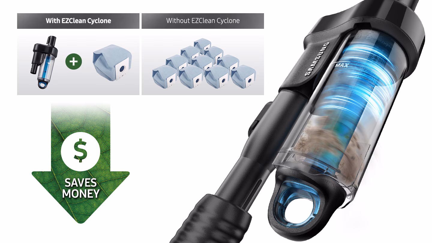 Jedinstveni filter EZClean Cyclone odvaja krupne čestice prašine koristeći centrifugalne sile. Kako kesa za prašinu prikuplja finu prašinu, imaćete četiri puta duže vremena do ponovnog čišćenja nego kod konvencionalnih Samsung usisivača,* a ostvaruju se i uštede na troškovima zamjene kesa za prašinu