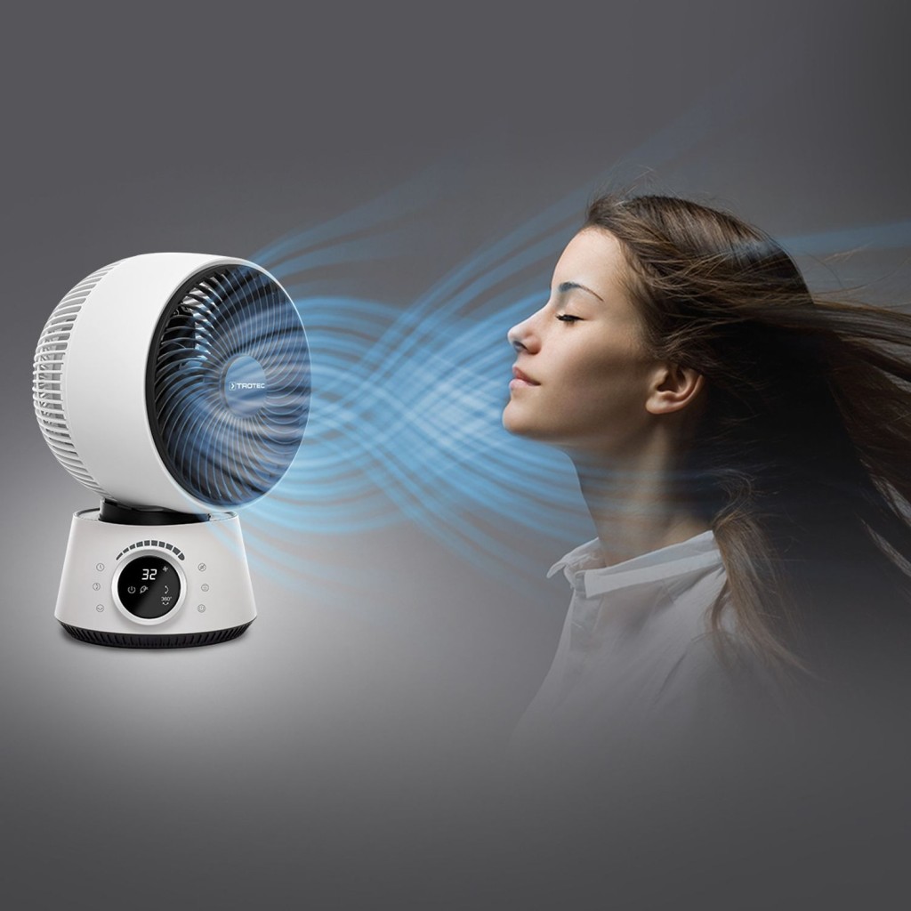 Udobne značajke 3-u-1 cirkulacijskog ventilatora, koje se ističu u ovoj klasi uređaja, svestrano su uvjerljive. Tri načina rada (ventilacija, prirodni vjetar, tihi noćni način rada), 32 razine vjetra i praktičan 12-satni mjerač vremena za vremenski kontrolirano uključivanje i isključivanje omogućuju individualnu integraciju TVE 100 u vaše osobno životno ili radno okruženje. Cirkulacijskim ventilatorom može se upravljati preko upravljačke ploče s okretnim prekidačem ili jednostavno putem isporučenog IR daljinskog upravljača.