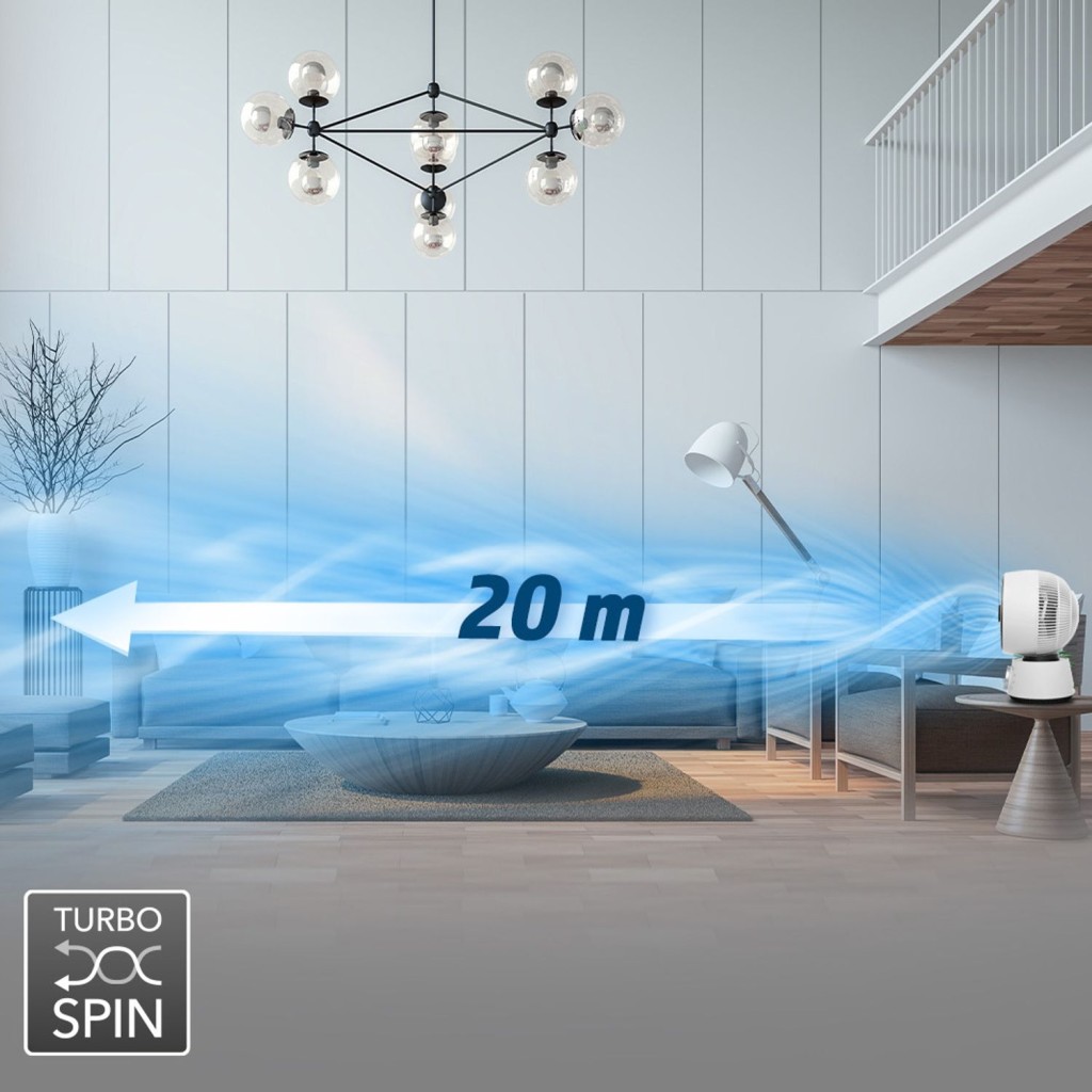 3-u-1 cirkulacijski ventilator za cirkulaciju zraka s difuzorom mirisnog ulja, patentiranom funkcijom zakretanja/nagiba i turbo spin tehnologijom.