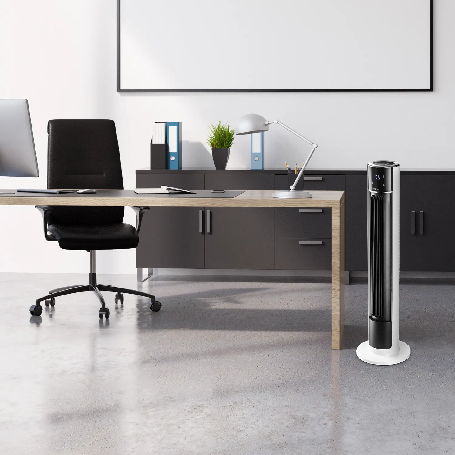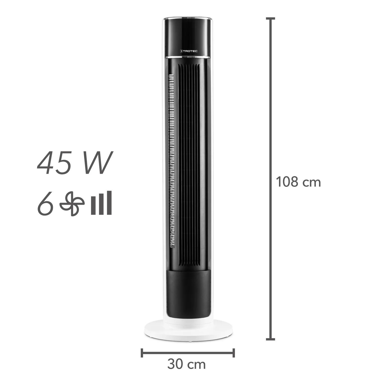 Sa 45 W snage i ukupno 6 brzina ventilatora, TVE 39 T uvijek pruža optimalnu količinu svježeg zraka. Bilo kao snažno puhanje vjetra ili suptilni povjetarac – prilagodite jačinu vjetra tačno onako kako vam najviše odgovara. S opcionalnom oscilacijom od 60°, ovaj toranj visok 108 centimetara pogodan je za veliku cirkulaciju zraka u prostoriji. Idealan je, na primjer, da se sobni zrak zagrijan tokom dana brzo provjetri kroz prozor ili da se hladan vjetar ravnomjerno rasporedi po cijeloj sobi.
