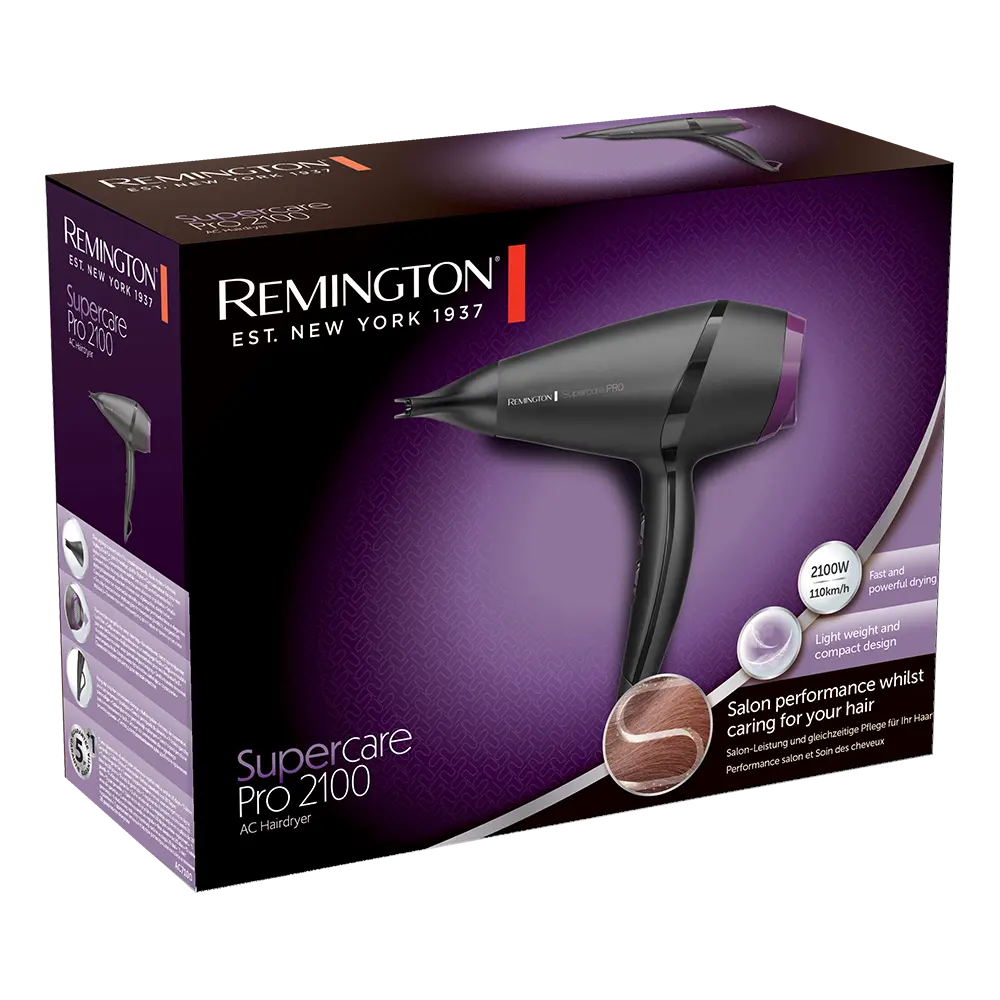 Uživajte u frizerskom iskustvu iz udobnosti vlastitog doma uz REMINGTON Supercare Pro AC7100 fen za kosu. Opremljen snažnim i dugotrajnim AC motorom od 2100 W, ovaj uređaj nudi brzinu sušenja do 110 km/h za efikasne i pouzdane rezultate – svaki put.