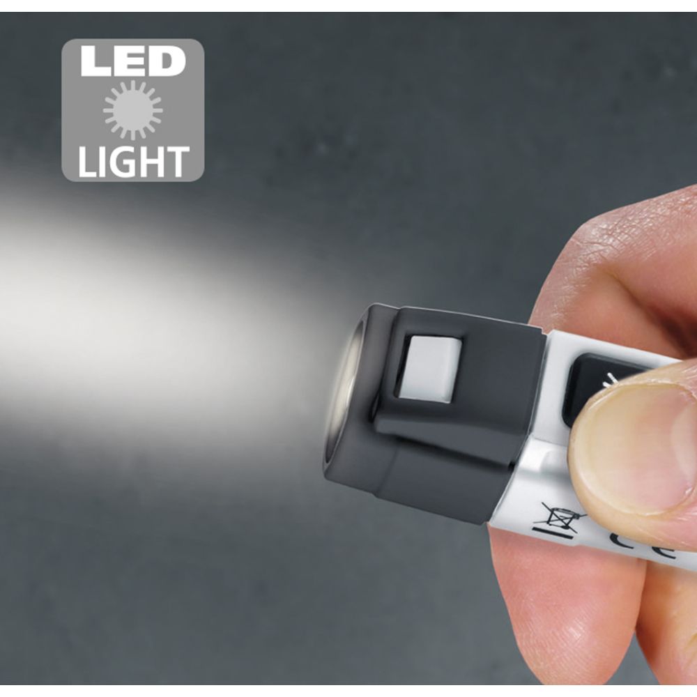 Opis: Ovaj beskontaktni ispitivač napona pruža visoku razinu industrijske sigurnosti detekcijom postojećih izmjeničnih napona. Uređaj određuje polaritet L- ili N-vodiča, detektira kablove pod naponom, čak i na većim dubinama, te locira električne napone u kabelima, utičnicama, grlima žarulja i osiguračima. Prekidi kabela mogu se učinkovito identificirati. Dobro vidljivi LED indikatori, kopča i integrirana svjetiljka čine ga vrlo praktičnim alatom.
