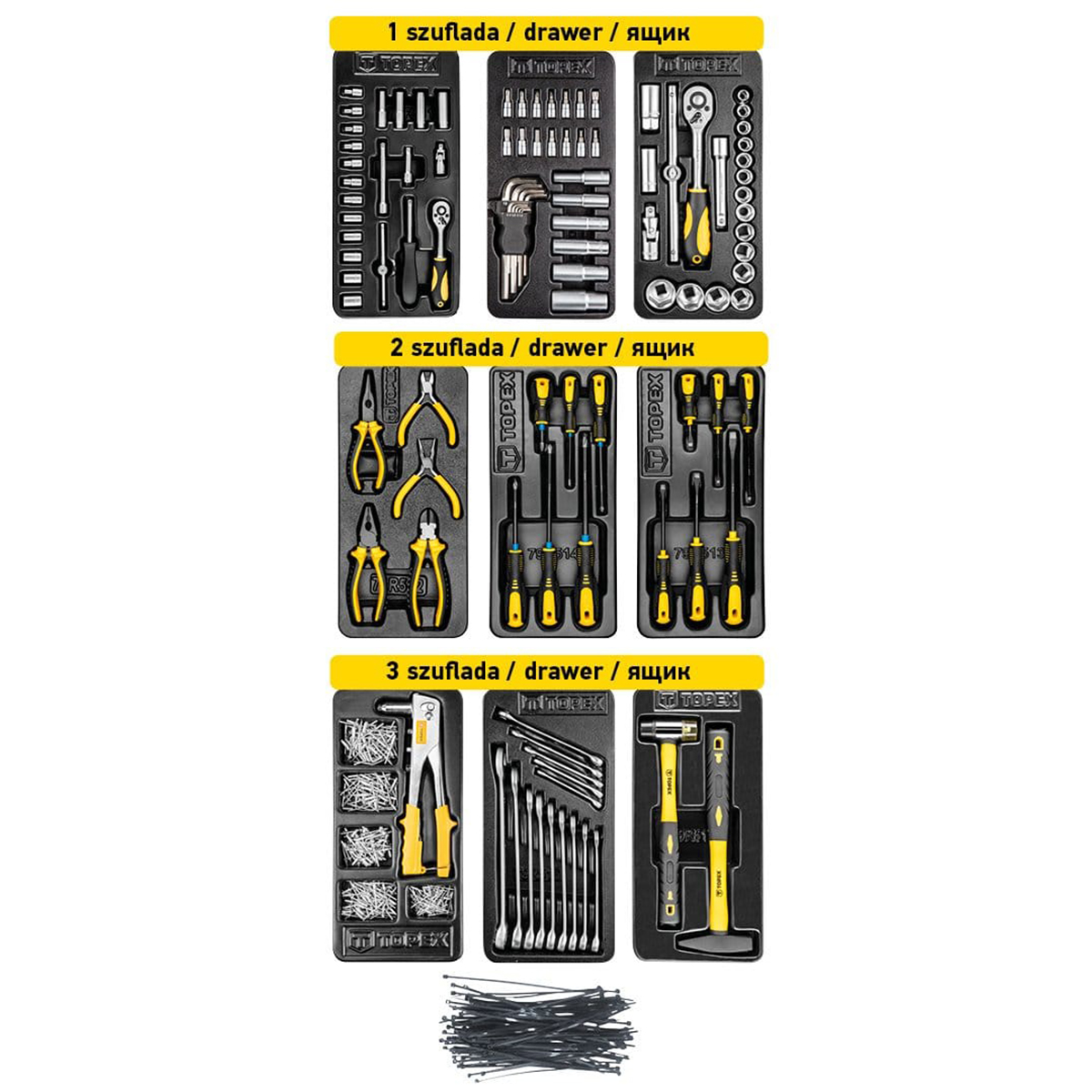 Kolica za alat sa 105 alata TOPEX 79R502 sastoji se od ukupno 455 elemenata: 105 alata + 250 zakovica + 100 stezaljki za crijeva.