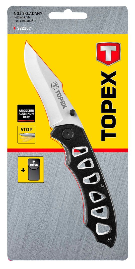 Džepni nož 76 mm TOPEX (98Z107) ima mnogo različitih primjena. Anodizirani aluminij od kojeg je tijelo izrađeno pruža trajnost i otpornost na koroziju. Posebni okidač osigurava oštricu od nenamjernog zatvaranja. Izdržljiva najlonska futrola omogućuje jednostavno skladištenje i nošenje.