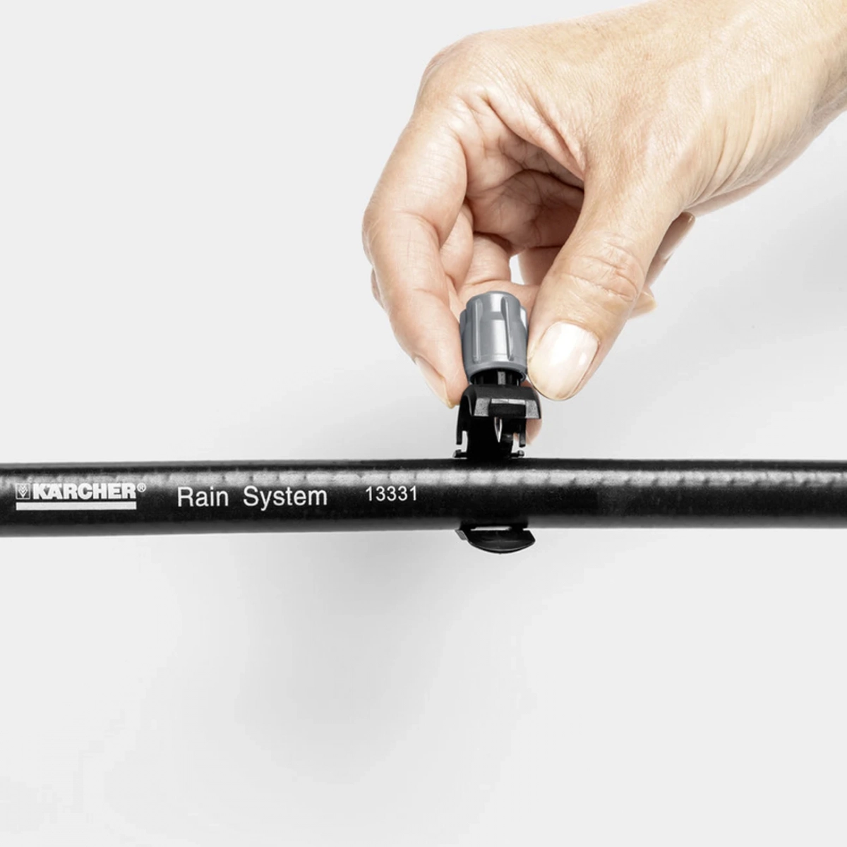 Obujmice za kapanje omogućuju neposredno navodnjavanje biljaka te čine dio inovativnog sustava “Kärcher Rain System®”. Moguće ih je postaviti na bilo koje mjesto Kärcher Rain System® crijeva. Montaža se izvodi brzo, jednostavno i bez alata. U tu je svrhu potrebno otvoriti obujmicu za kapanje, crijevo za navodnjavanje uz pomoć integrirane igle zabosti na željeno mjesto i obujmicu fiksirati zatvaranjem. Gotovo. Zahvaljujući okretnoj glavi moguće je namjestiti količinu vode od 0 – 10 l/h ovisno o potrebi i tako izbjeći nepotrebno trošenje vode. Maksimalno učinkoviti sustav navodnjavanja “Kärcher Rain System®” radi s tlakom do 4 bara, ima crijevo promjera 1/2″ s obujmicama za kapanje i obujmicama za raspršivanje te objedinjuje prednosti Micro-Drippinga i tradicionalnog navodnjavanja. “Kärcher Rain System®” moguće je individualno prilagoditi gotovo svakom tipu vrta i savršeno surađuje sa SensoTimer-om za upravljanje navodnjavanjem sukladno potrebama.