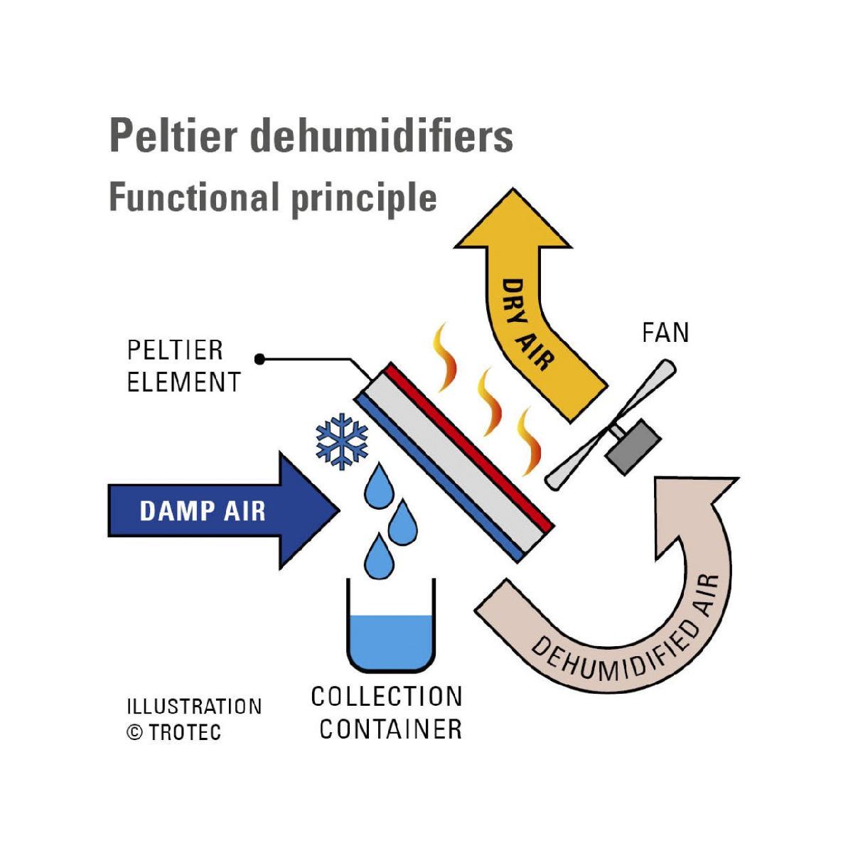 Peltier odvlaživač je idealno rješenje posebno u prostorijama osjetljivima na vlažnost, kao npr. ormari za odjeću i cipele, komore za skladištenje hrane ili čak male sanitarne prostorije bez prozora. TTP 10 E oslobađa prekomjernu vlagu ili smanjuje kondenzaciju i na taj način spriječava rast plijesni.