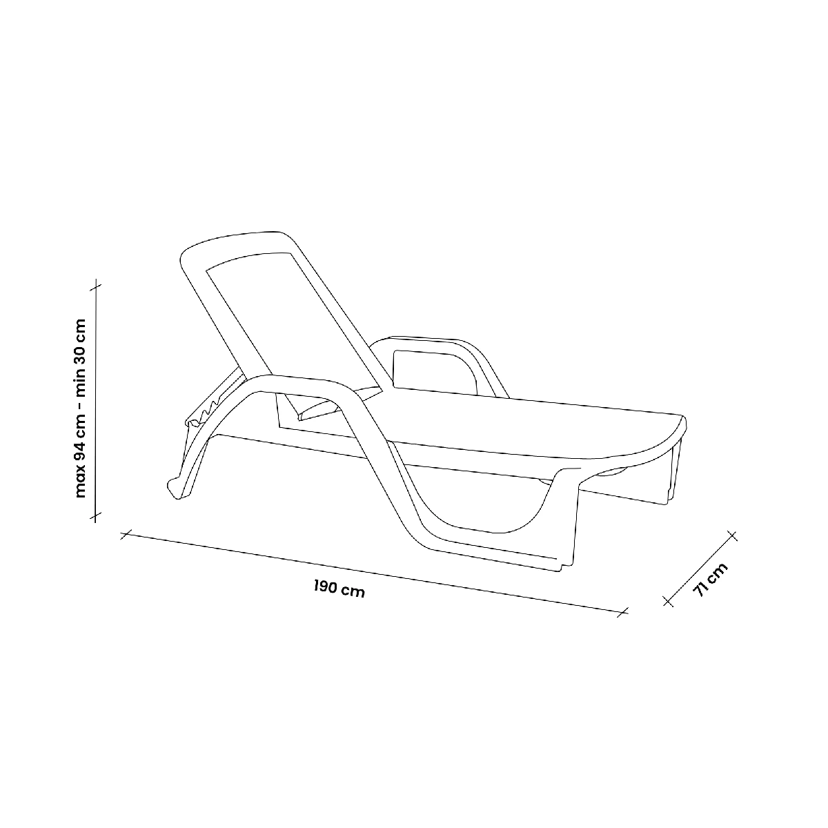 Plastična ležaljka sa mat završnom obradom. Smola koja se može reciklirati. Podesivi naslon: maksimum 94 cm – minimum 30 cm.