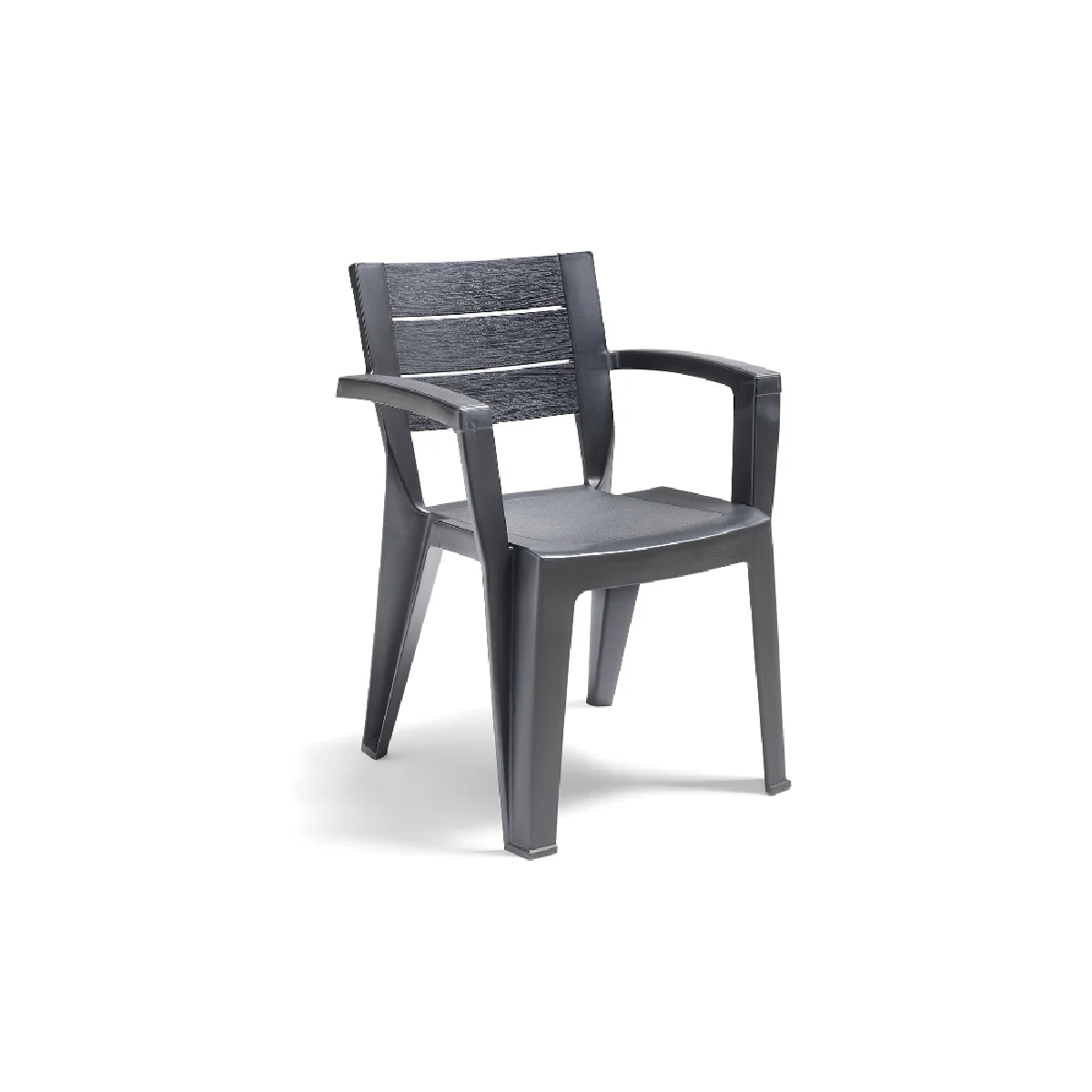 Plastična, monoblok stolica sa naslonima za ruke, pogodna za slaganje. Visok, letvičasti leđni naslon. Mat završna obrada.