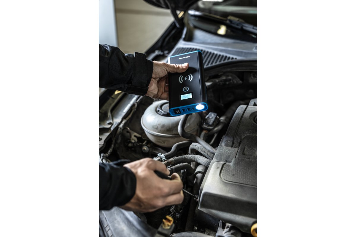Jump starter sa strujom od 400A, koja se privremeno može povećati na 800A, pouzdano je rješenje za hitne situacije povezane s baterijom vašeg vozila. Baterija, izrađena na litij-polimer tehnologiji, jamči dug vijek trajanja i sigurnu upotrebu uređaja. Zaslon omogućuje provjeru stanja napunjenosti baterije. Osim toga, jump starter je opremljen svjetiljkom s tri funkcije – kontinuirano svjetlo, treptajuće svjetlo i SOS svjetlo, što može biti izuzetno korisno u slučaju kvara nakon mraka. Također ima 2 USB priključka za punjenje telefona ili drugog uređaja. Dodatna značajka ovog uređaja je ugrađeni indukcijski punjač, koji omogućuje punjenje kompatibilnih uređaja bez potrebe za korištenjem kabela. Induktivna tehnologija punjenja je praktična, jednostavna i omogućuje brzo punjenje Qi-kompatibilnog uređaja.