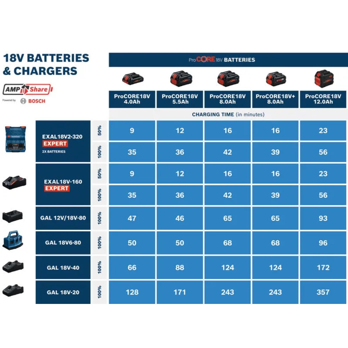 Iznimno brzi paralelni punjač za otežane uvjete primjene. Ima 5 LED lampica koje precizno prikazuju razinu napunjenosti akumulatora. Kompatibilan je s Bosch profesionalnim sustavom 18V i sa sustavom AMPShare, koji je nastao udruživanjem više različitih marki akumulatora.