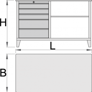 5 ladica (3 dimenzije 560x570x70mm, 1 dimenzija 560x605x150mm) drvena radna površina materijal: Premium Plus lim nosivost ladica: 45kg obložena eko bojom Qualicoat standard kvalitetom police sa kugličnim vodilicama sa sistemom zaključavanja sintetičke podloge štite ladice i alat od oštećenja statička nosivost stola: 2300kg |