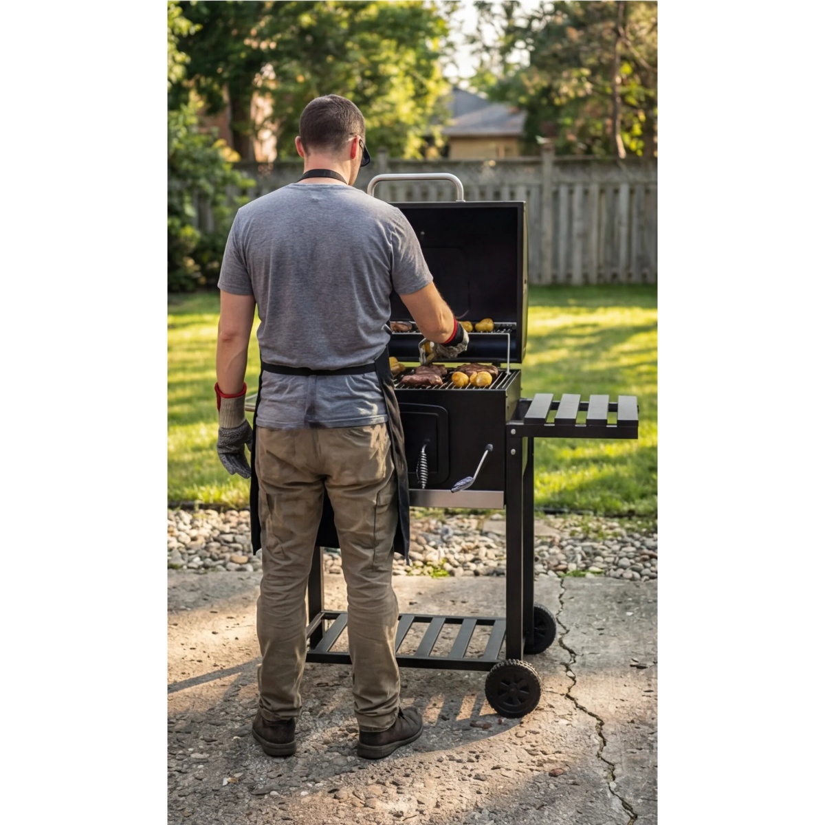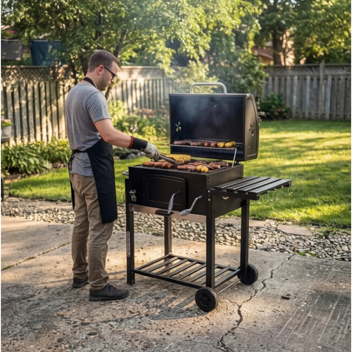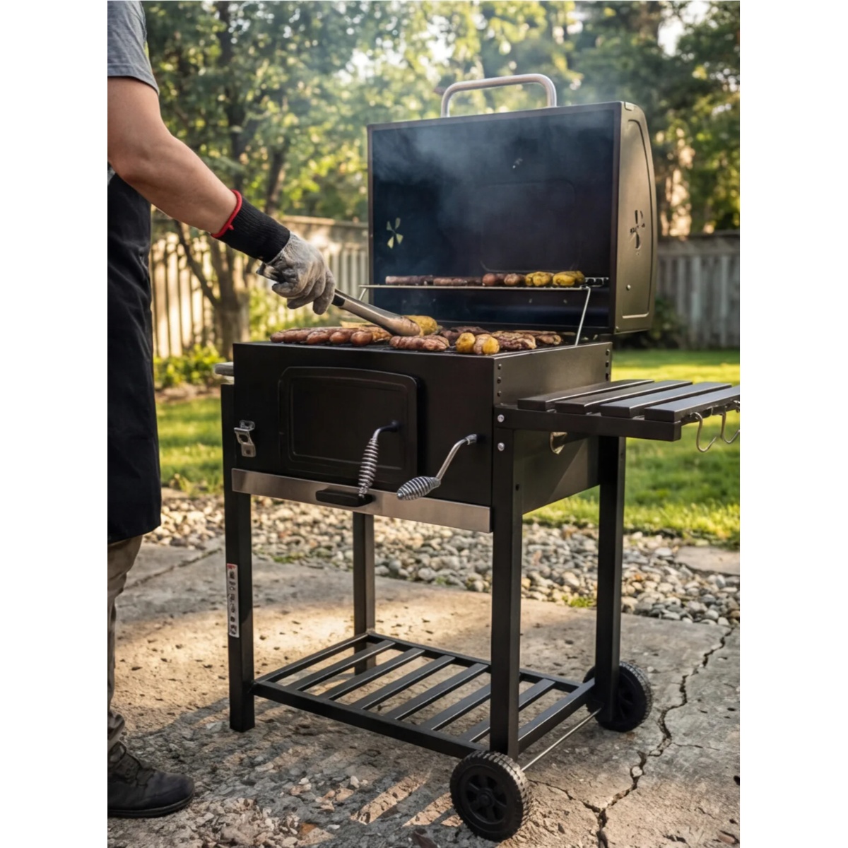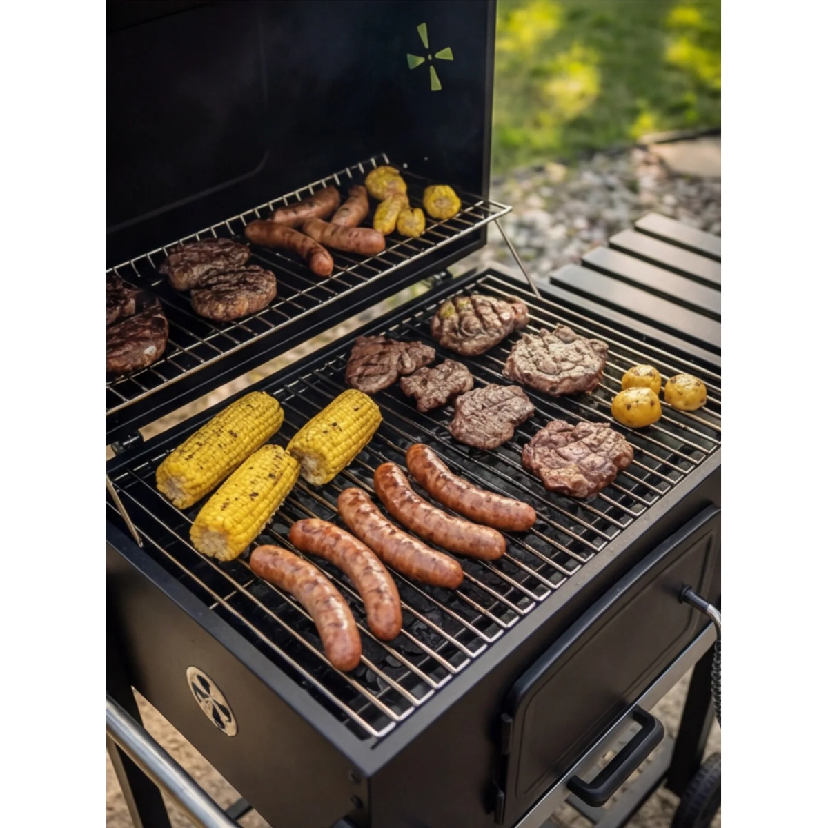 - Materijal: Roštilj je izrađen od čeličnog lima, što osigurava visoku otpornost na koroziju i dug vijek trajanja, čak i uz čestu upotrebu. Poklopac i ložište su presvučeni emajlom otpornim na visoke temperature, što osigurava ravnomjerno sagorijevanje drvenog uglja.